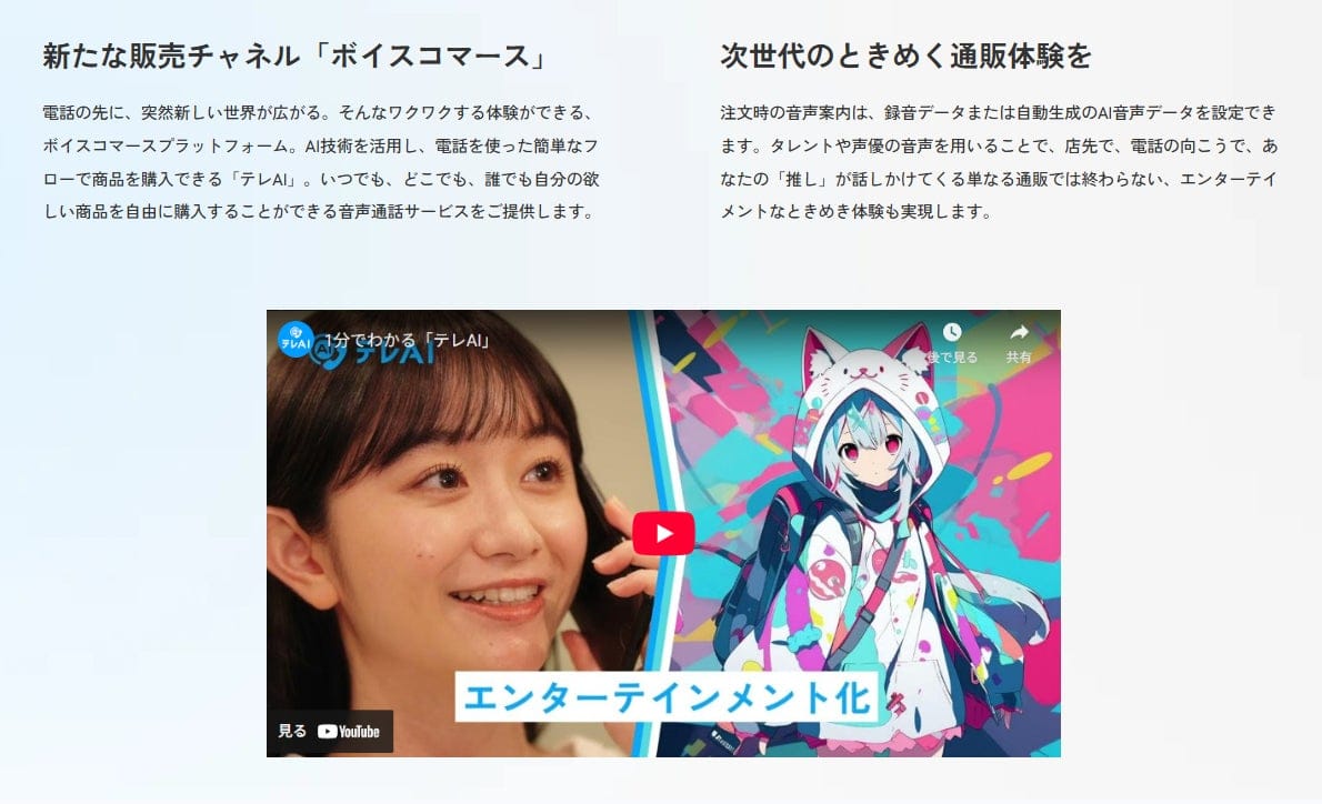 テレ株式会社は、AIと電話を組み合わせたボイスコマースを推進し、注文の自動化や「推しの声」による購買体験を特徴とする。公式サイトはhttps://te0.jp/