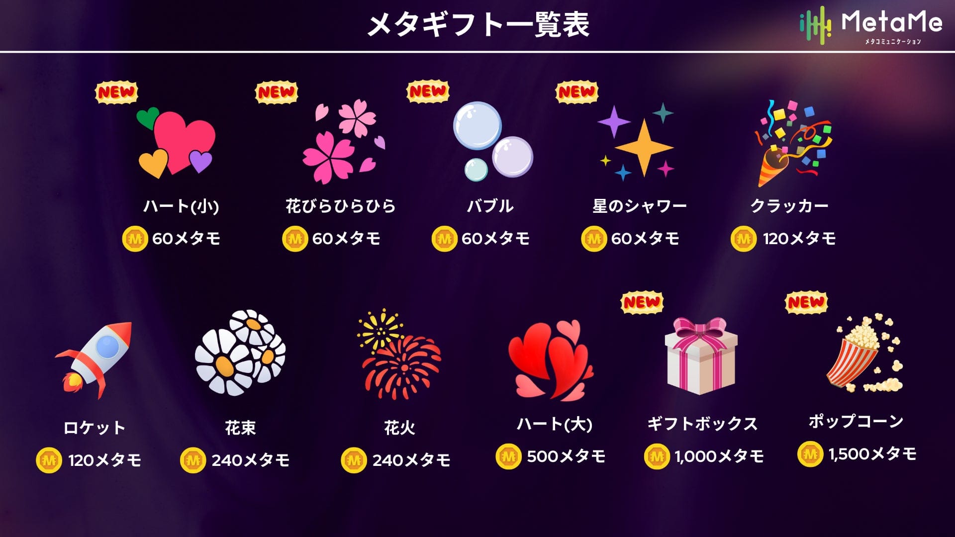 「ハート(小)」「花びらひらひら」「バブル」「星のシャワー」「ギフトボックス」「ポップコーン」といった多彩な演出で、シチュエーションや感情に応じて選べる楽しさも加わりました。「メタギフト」を通じて、“応援が見える・届く・つながる”体験を、ぜひこの機会にお楽しみください。