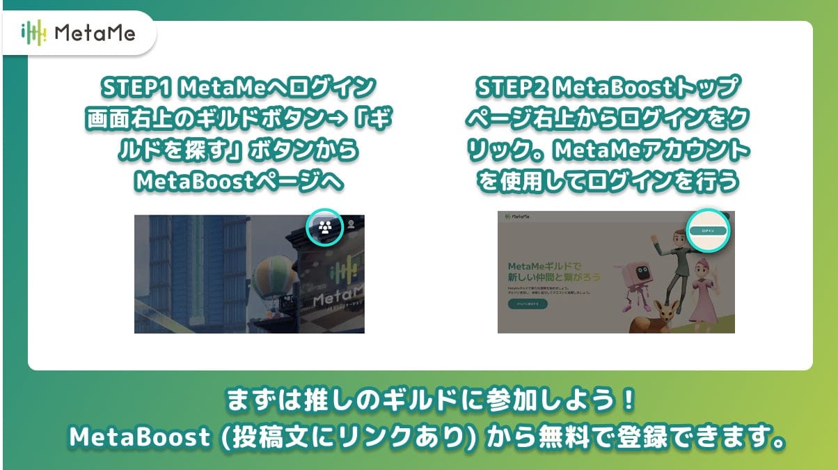 ギルド情報がまとまった「MetaBoost」ページに移動します。ページ右上の「ログイン」ボタンから、MetaMeのアカウントを使ってログインしてください。