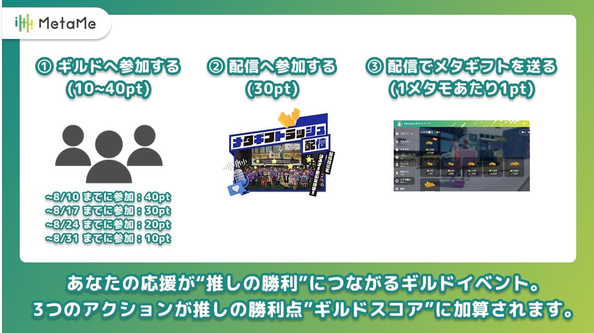 ルールは、MetaMeに無料登録後、推しVTuberのギルドに参加し、ライブ配信を視聴しながらメタギフトで応援。ギルドの累計スコアが上位に入ると、渋谷街頭ビジョン出演などの特典獲得につながるとしている。参加はMetaMe公式サイトの「ギルド」から選択し、ギルド情報がまとまる「MetaBoost」ページでログインの上、「参加」ボタンで完了する流れだ。