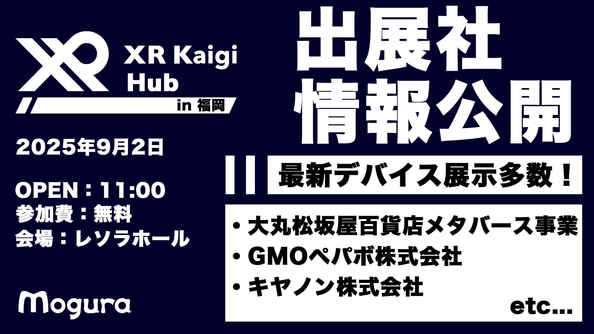 株式会社Moguraは、国内最大級のXRカンファレンス「XR Kaigi」の姉妹イベントとして、2025年9月2日(水)に 福岡県・福岡市の「レソラホール」にて「XR Kaigi Hub in 福岡」を開催いたします。