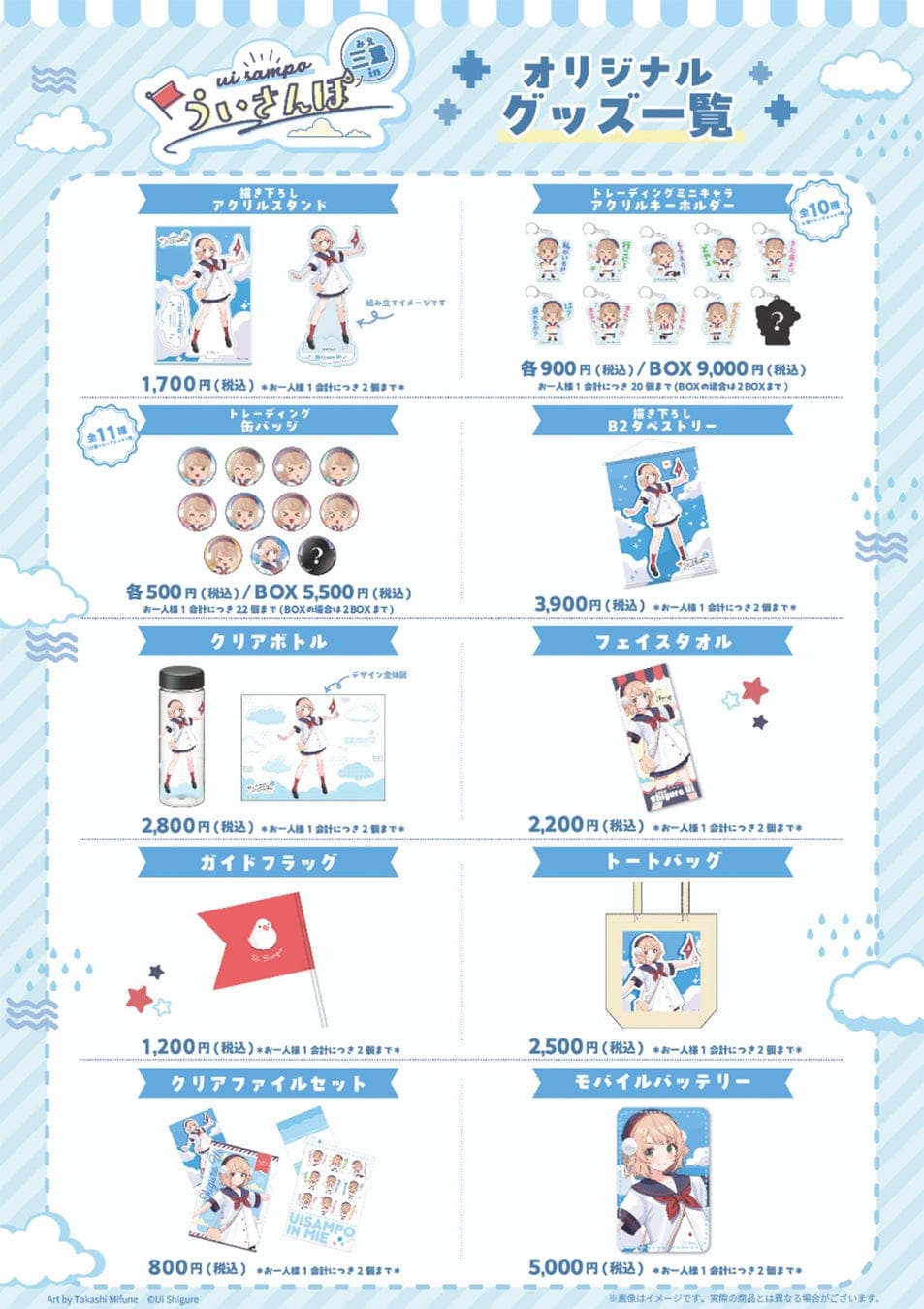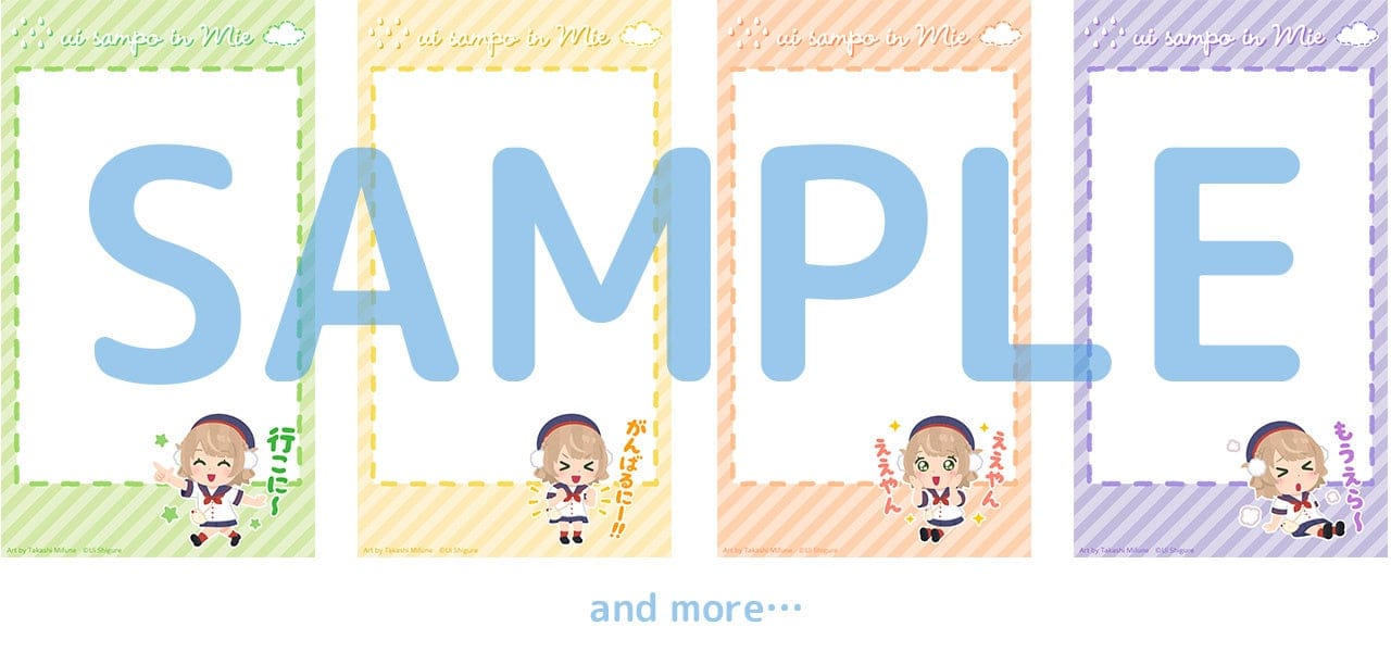 三重県の名所を巡るスタンプラリーのほかに、本イベントのためにしぐれうい自身が描き下ろしたイラストや、“いらすとや”による描き起こしミニキャライラストを使用した、オリジナルグッズや特典を用意しております。