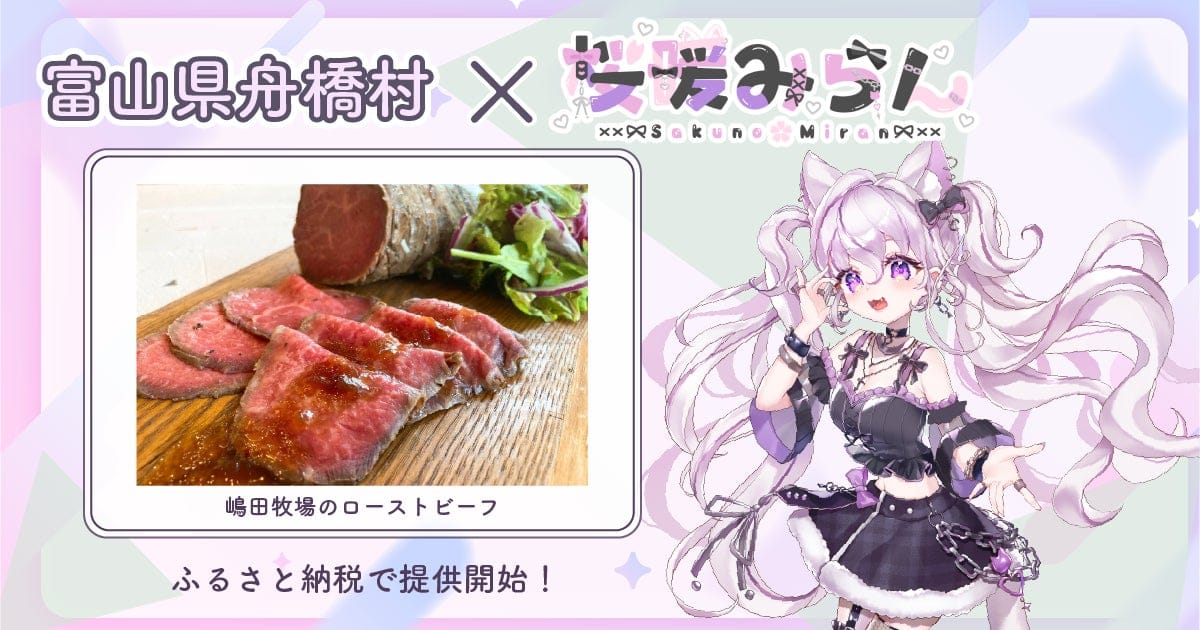料理系VTuber「桜暖みらん」が富山県舟橋村のふるさと納税返礼品「嶋田牧場のローストビーフ300g」とコラボし、2025年8月8日20時より提供を開始すると発表された。寄付金額は18,000円で、株式会社あるやうむが運営するサイトで受け付けるとのこと。