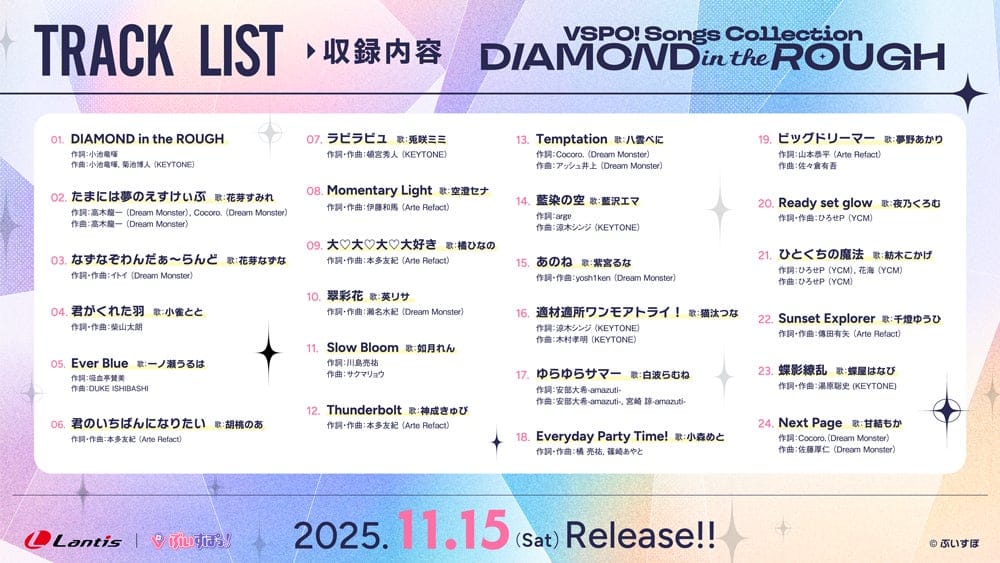 本アルバムは「ダイヤモンドの原石」をテーマに、涼木シンジや本多友紀ら人気クリエイターが楽曲制作を担当。メンバー23名による全体曲を含む全24曲を収録しており、2025年11月22日~24日にLaLa arena TOKYO-BAYで開催される『ぶいすぽっ!フェス 2025』で初披露される予定だ。