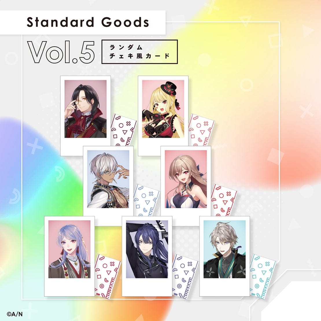 新ビジュアルを使用したグッズシリーズ「Standard Goods」より、Vol.5にはにじさんじライバーの弦月藤士郎、長尾景、甲斐田晴、フレン・E・ルスタリオ、イブラヒム、シェリン・バーガンディ、ルイス・キャミー 7名の「アクリルスタンド」と「ランダムチェキ風カード」の販売が決定いたしました。