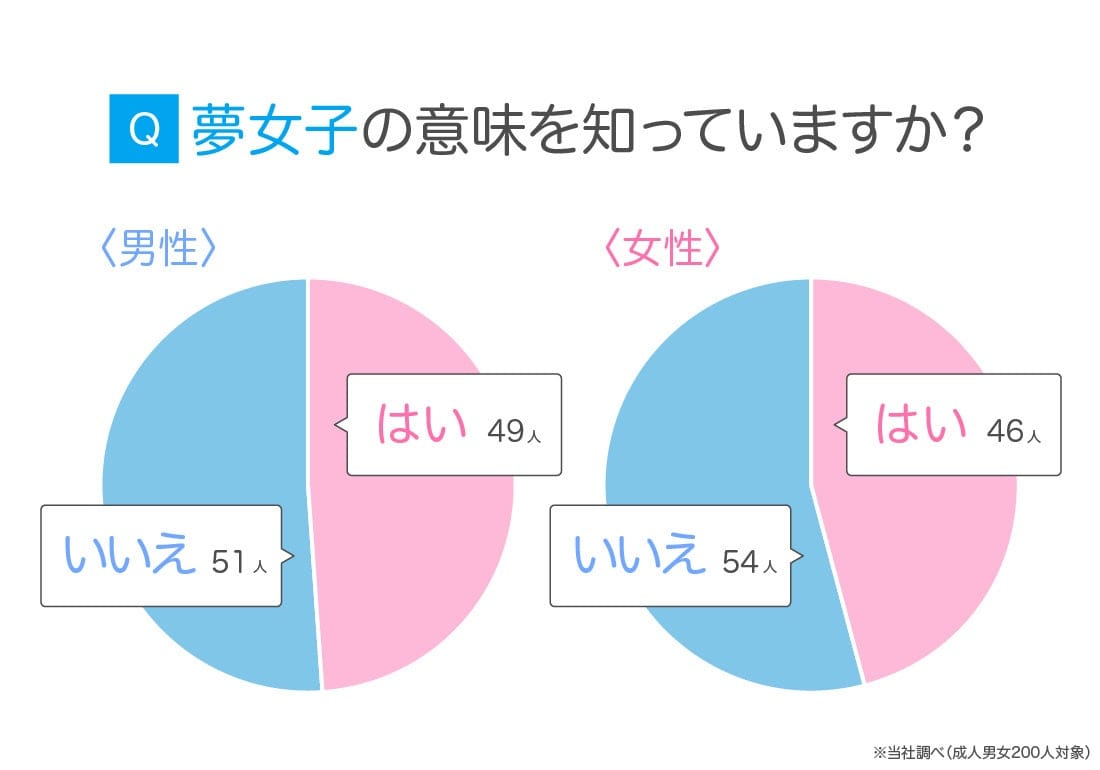 成人男女200人に、「夢女子」の意味を知っているか尋ねたところ、「はい」と「いいえ」がほぼ半数に分かれる結果となりました。