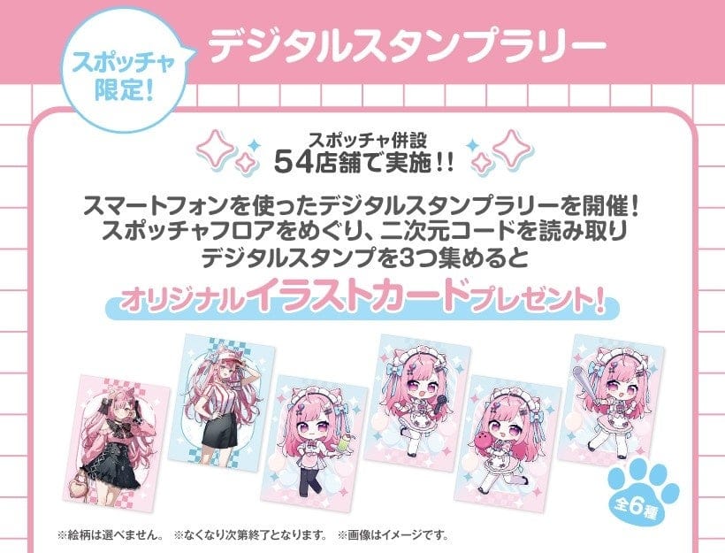 全国のラウンドワン内のスポッチャ54店舗でスマートフォンを使用した【デジタルスタンプラリー】施策を実施いたします。スポッチャフロアをめぐり、デジタルスタンプを3つ集めていただいた方に【オリジナルイラストカード(全6種)】を1枚差し上げます。