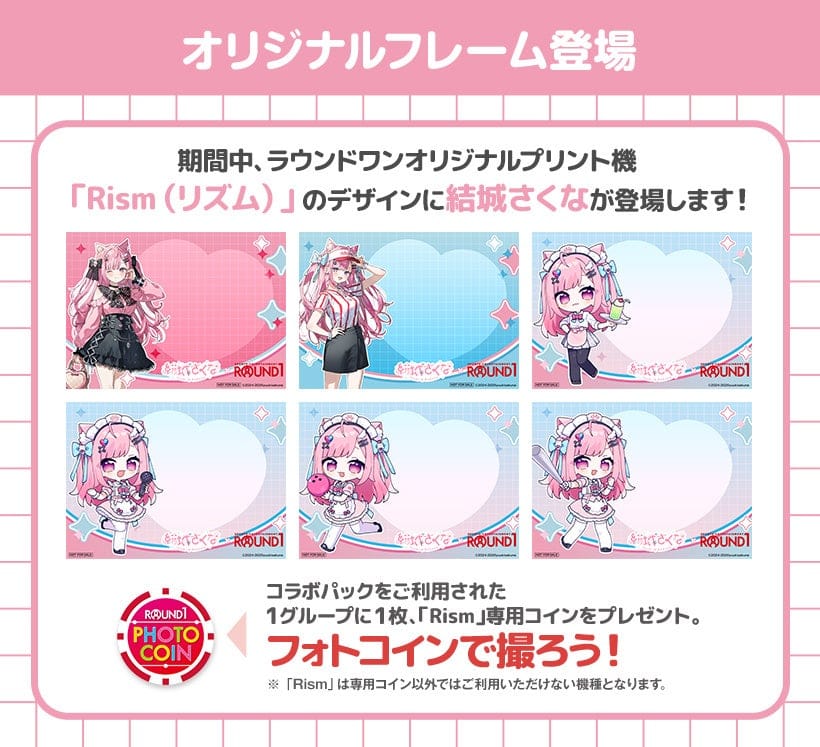 たします。さらに、ラウンドワンのオリジナルフォトプリント機「Rism(リズム)」にて、『結城さくな』のフレームで撮影ができる専用コインを1グループにつき1枚プレゼントいたします。