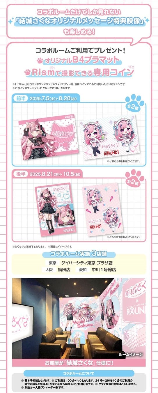 ダイバーシティ東京 プラザ店、梅田店、中川1号線店の3店舗限定で、『結城さくな』の装飾を施したコラボルームを展開いたします。コラボルームのご利用で【オリジナルB4プラマット】をプレゼントい