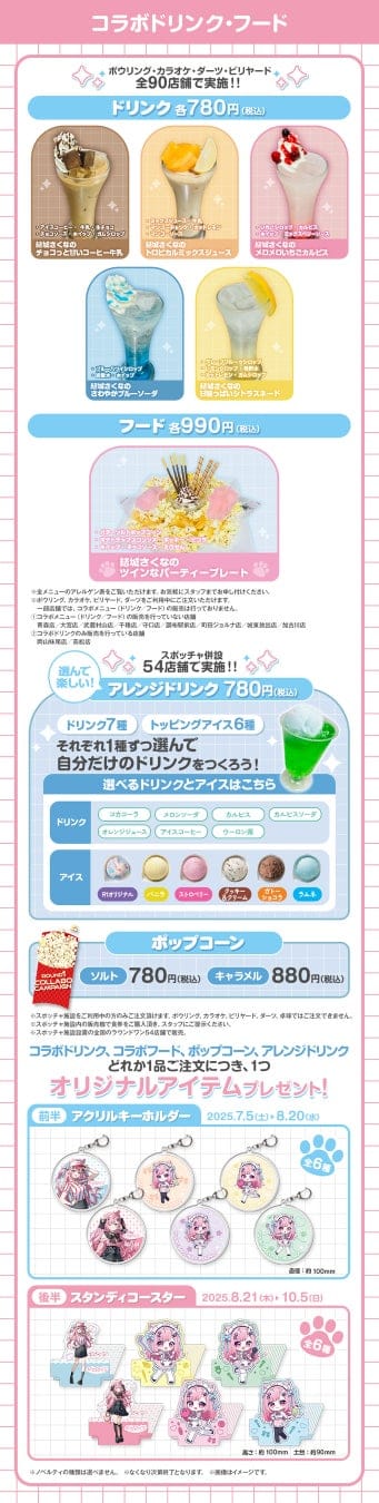 全国のラウンドワン内にあるボウリング・カラオケ・ダーツ・ビリヤードの90店舗にて、コラボメニューを販売いたします。さらに、スポッチャ54店舗では、お好きなドリンクにアイスを自由にトッピングしてお楽しみいただけるアレンジドリンクもご提供いたします。いずれかの対象メニューをご注文いただいたお客様には、オリジナルノベルティをプレゼントいたします。