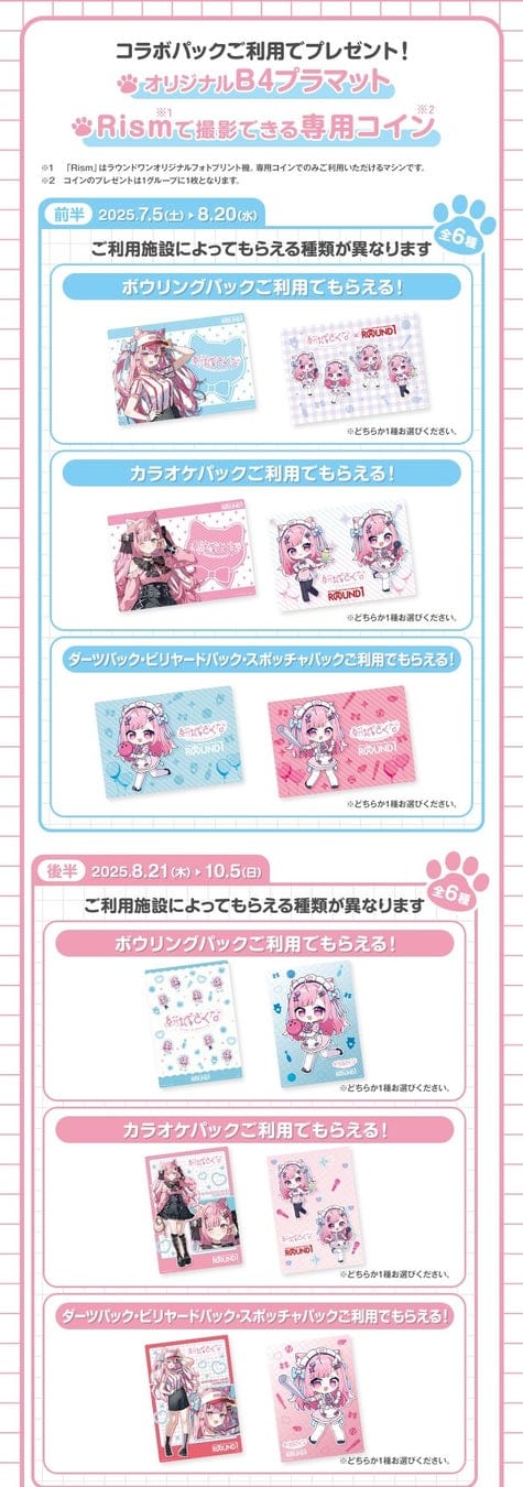 全国のラウンドワン内のカラオケ92店舗、ボウリング97店舗、ビリヤード46店舗、ダーツ74店舗、スポッチャ54店舗でコラボパックを販売いたします。コラボパックをご利用いただいたお客様には、オリジナルB4プラマットをプレゼントいたします。さらに、ラウンドワンのオリジナルフォトプリント機「Rism(リズム)」にて、『結城さくな』のフレームで撮影ができる専用コインを1グループにつき1枚プレゼントいたします。
