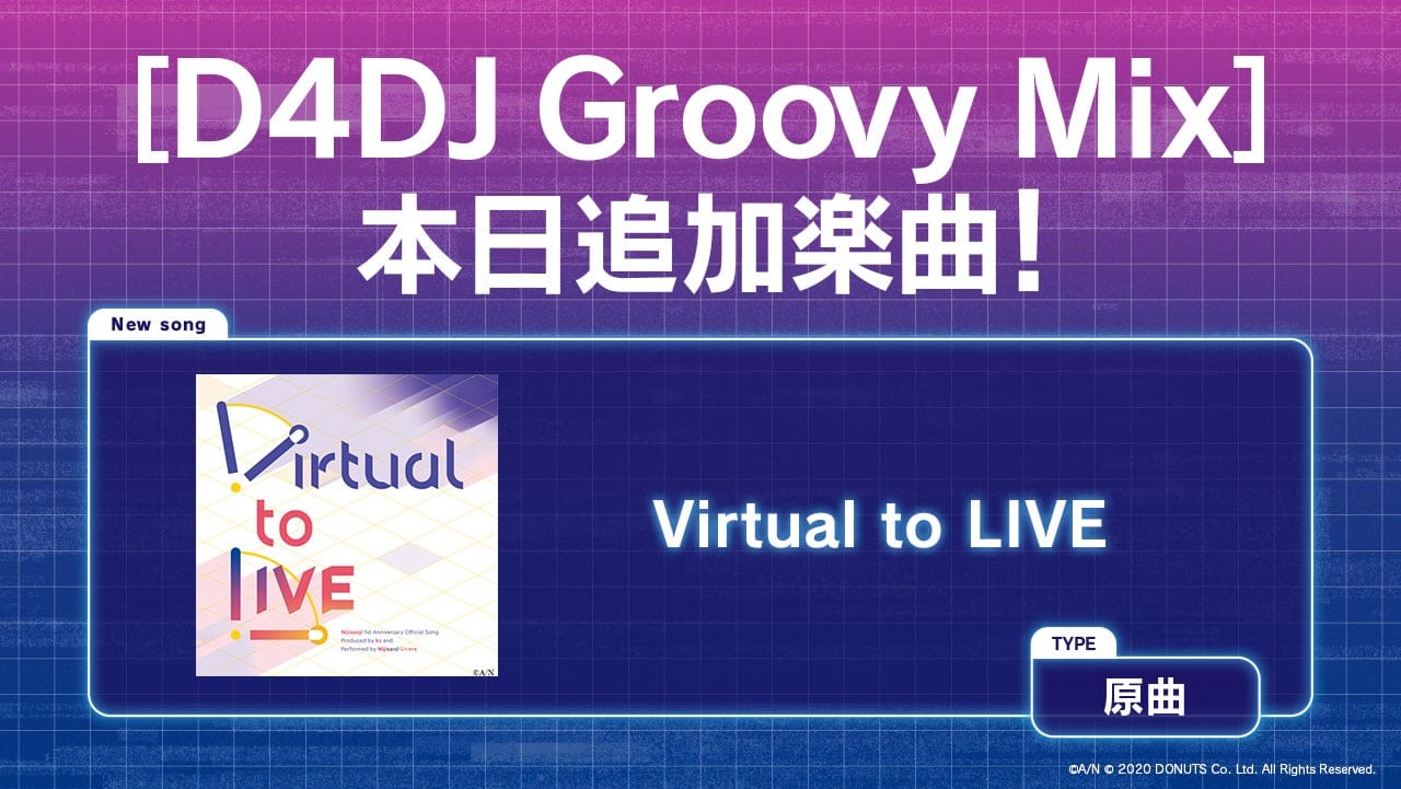 株式会社DONUTS(東京都渋谷区、代表取締役:西村啓成)は、スマートフォン向けリズムゲーム「D4DJ Groovy Mix」(以下グルミク)にて、『にじさんじ』1周年記念楽曲「Virtual to LIVE」を8月20日(水)18:00に実装いたしました。