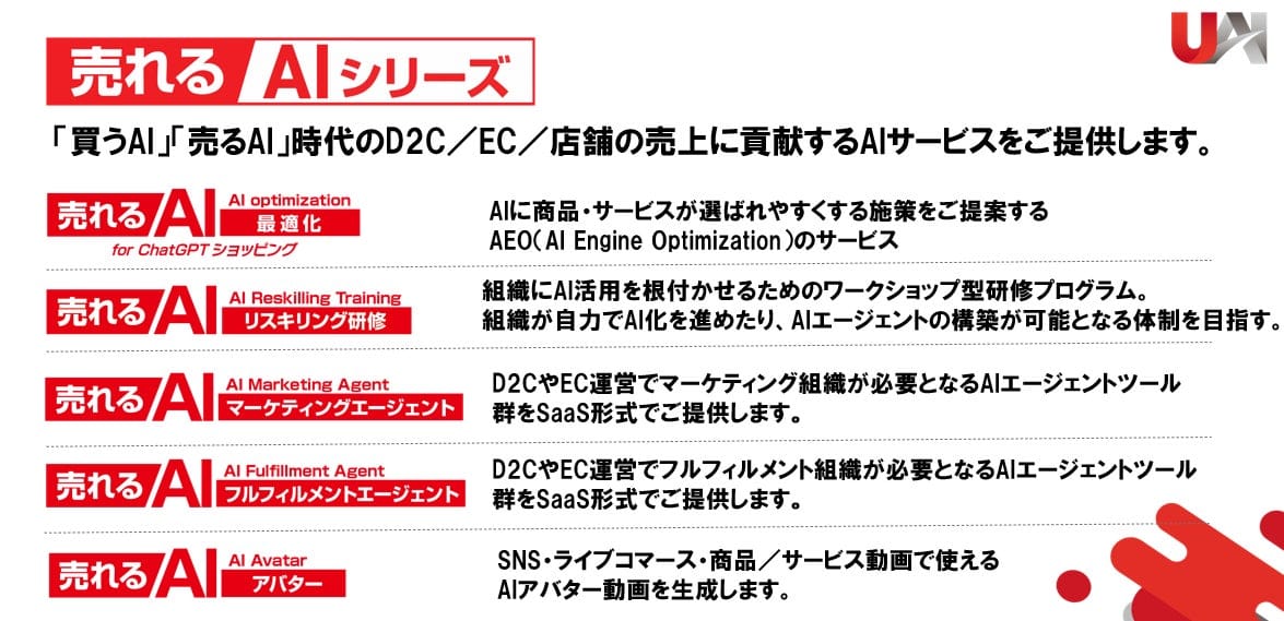 売れるAIマーケティング社は、『売れるAIアバター』を皮切りに、「売れるAIシリーズ」として、あらゆるビジネスの“売上”をAIの力で最大化する、究極のAIソリューション・プラットフォームを構築してまいります。AI消費者の購買活動を代行する「買うAI」時代に対応する『売れAI最適化』や、組織のAI戦闘力を飛躍的に向上させる『売れるAIリスキリング研修』など、D2C/EC/店舗の売上に直結する革新的なAIサービスを続々と市場に投下していく計画です。