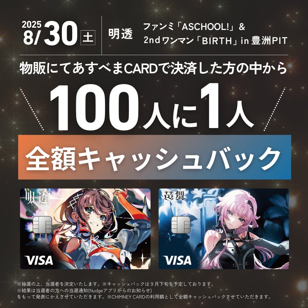 また8月30日に豊洲PITで開催される明透の4周年記念イベント「あすナー’s meeting」と2ndワンマンライブでは、カード会員向けに限定ノベルティプレゼントや、現地決済者対象の抽選キャッシュバック企画が実施される予定だ。