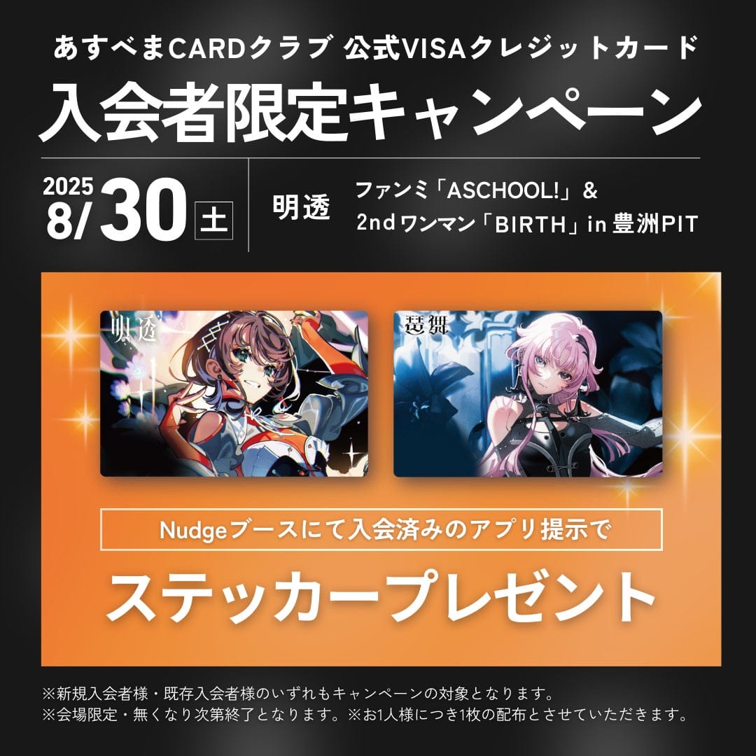 また8月30日に豊洲PITで開催される明透の4周年記念イベント「あすナー’s meeting」と2ndワンマンライブでは、カード会員向けに限定ノベルティプレゼントや、現地決済者対象の抽選キャッシュバック企画が実施される予定だ。