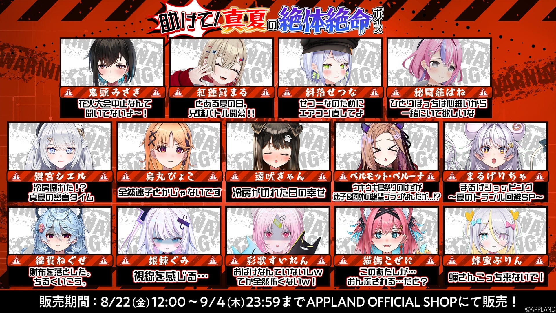 株式会社アップランド(本社:東京都世田谷区)は、同社が運営するVTuberグループ「.LIVE」と「ぶいぱい」メンバーによるボイス商品『助けて!真夏の絶体絶命ボイス』の販売を、2025年8月22日(金)12時より開始すると発表した。