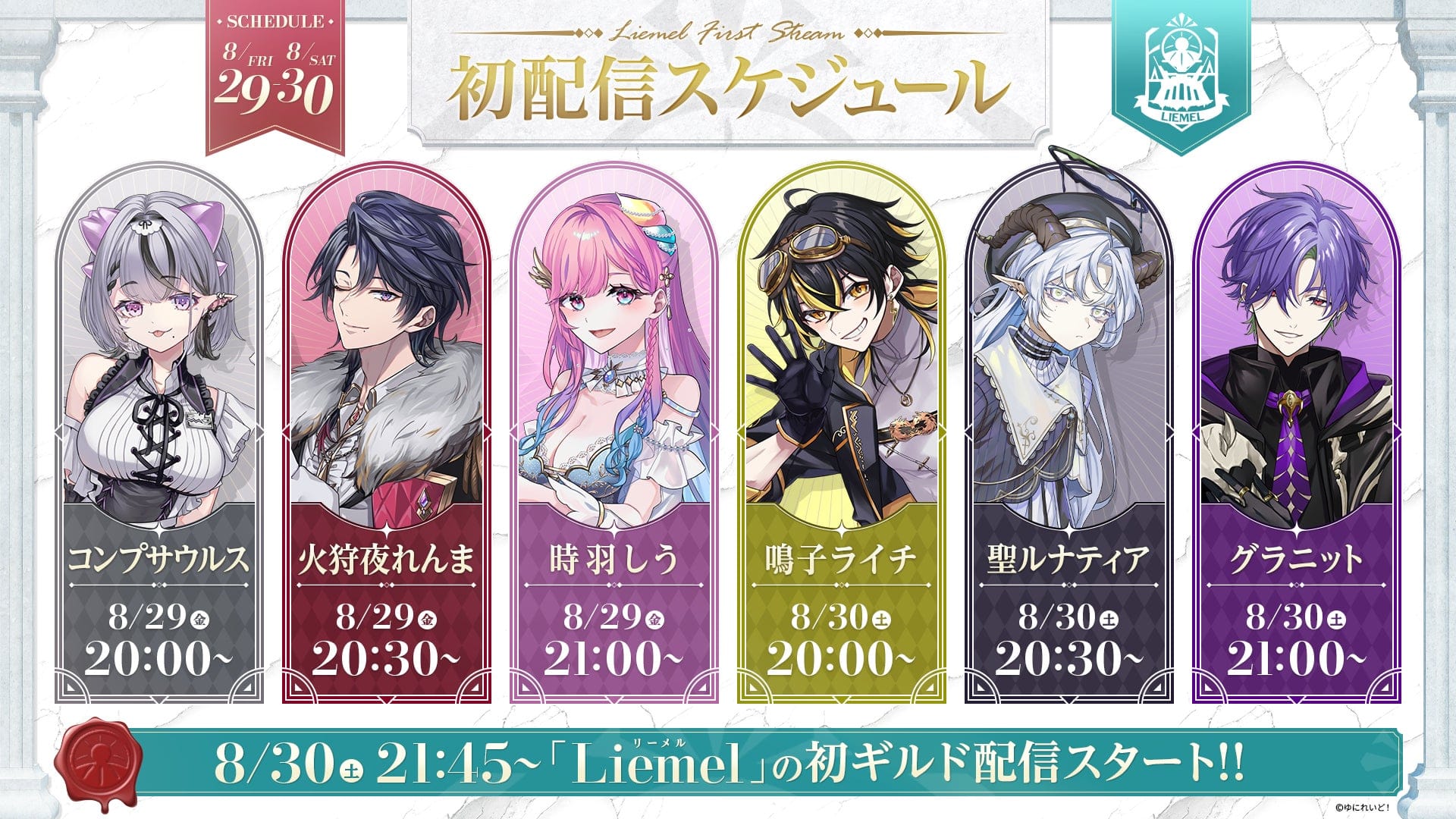 新メンバーは2025年8月29日と30日の2日間にかけてYouTubeで初配信を実施する予定。8月29日20時からはコンプサウルス、火狩夜れんま、時羽しうが順次配信を開始し、30日には鳴子ライチ、聖ルナティア、グラニットが登場。最終日21時45分からは全員参加の初ギルド配信が行われる。