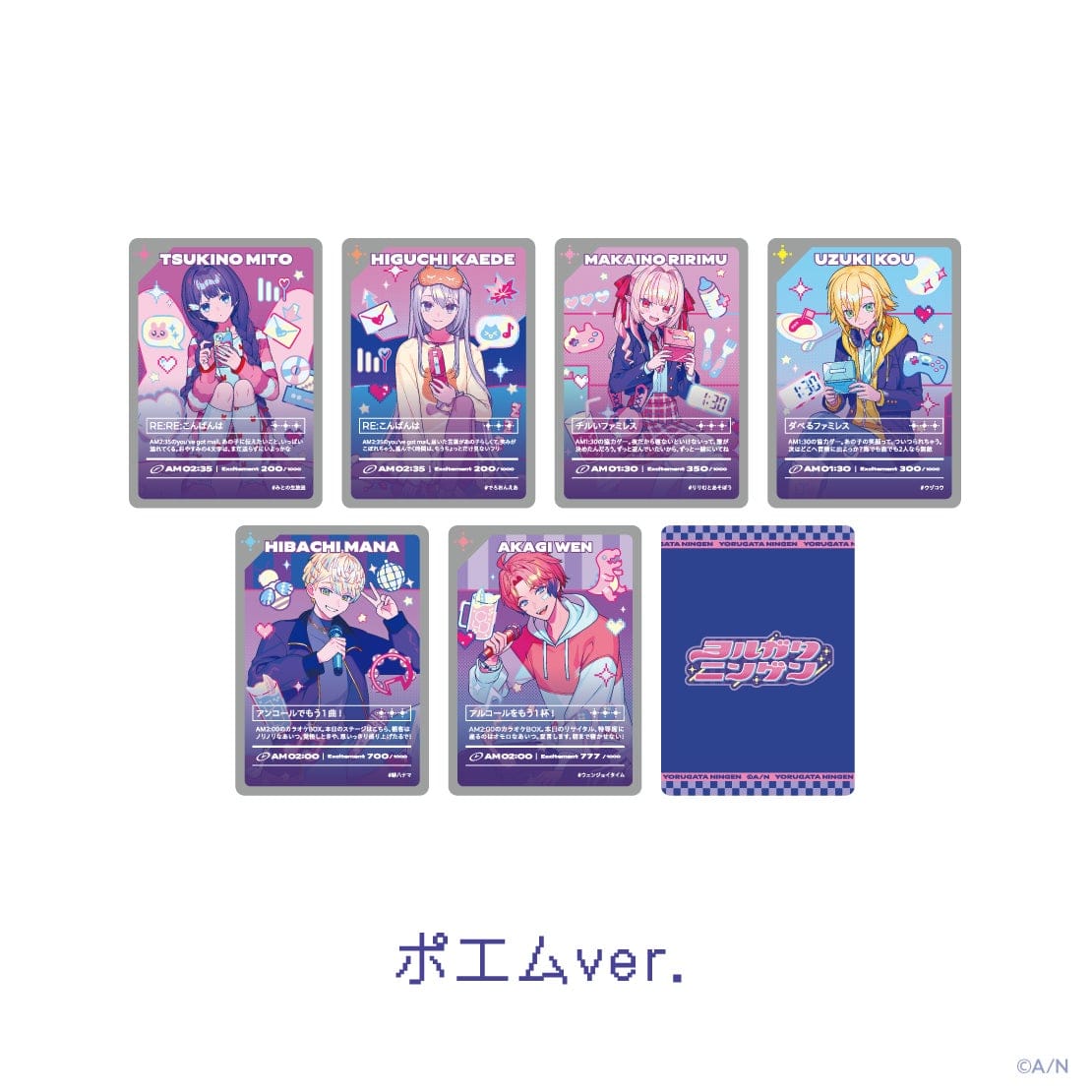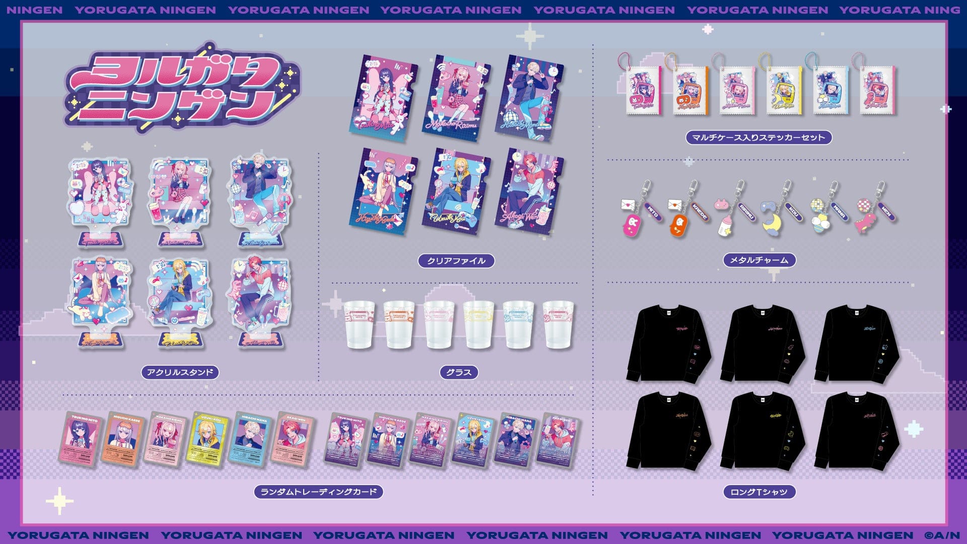 グッズラインナップは、ランダムトレーディングカード、アクリルスタンド、マルチケース入りステッカーセット、クリアファイル、メタルチャーム、グラス、ロングTシャツの7種類。