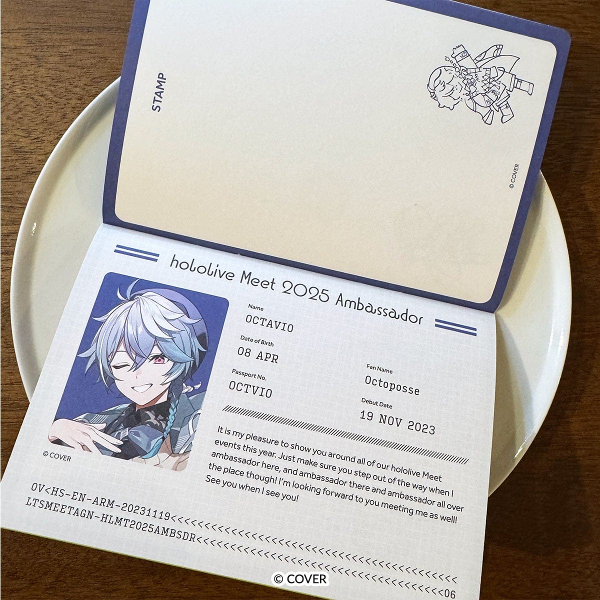 パスポートそっくりな「hololive Meet パスポート型ノート」は、スタンプ帳としても使えるミニノートです。表紙は存在感のあるhololive Meetロゴが箔押しされた豪華仕上げ。32ページの中面は、6人のアンバサダーからのメッセージがレイアウトされたプロフィールページや、スタンプを集めるためのノートページ、デフォルメキャラが散らされたメモページで構成されています。参加したイベント情報を書き込むあなたのためのプロフィールページもありますよ。hololive Meetが出展する世界のイベントに参加して、hololive Meet 記念スタンプを集めよう!