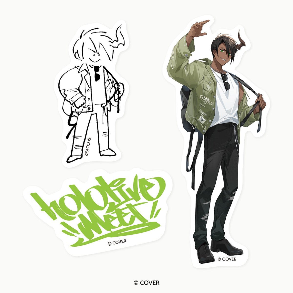 各アンバサダーのキービジュアルの姿とデフォルメされた姿、グラフィティ風hololive Meetサインの3種のステッカーがセットになったダイカットステッカーセットです。身近なアイテムに貼ったり、クリアタイプのスマホケースに挟んだりと、アイデア次第で様々なカスタムをお楽しみいただけます。