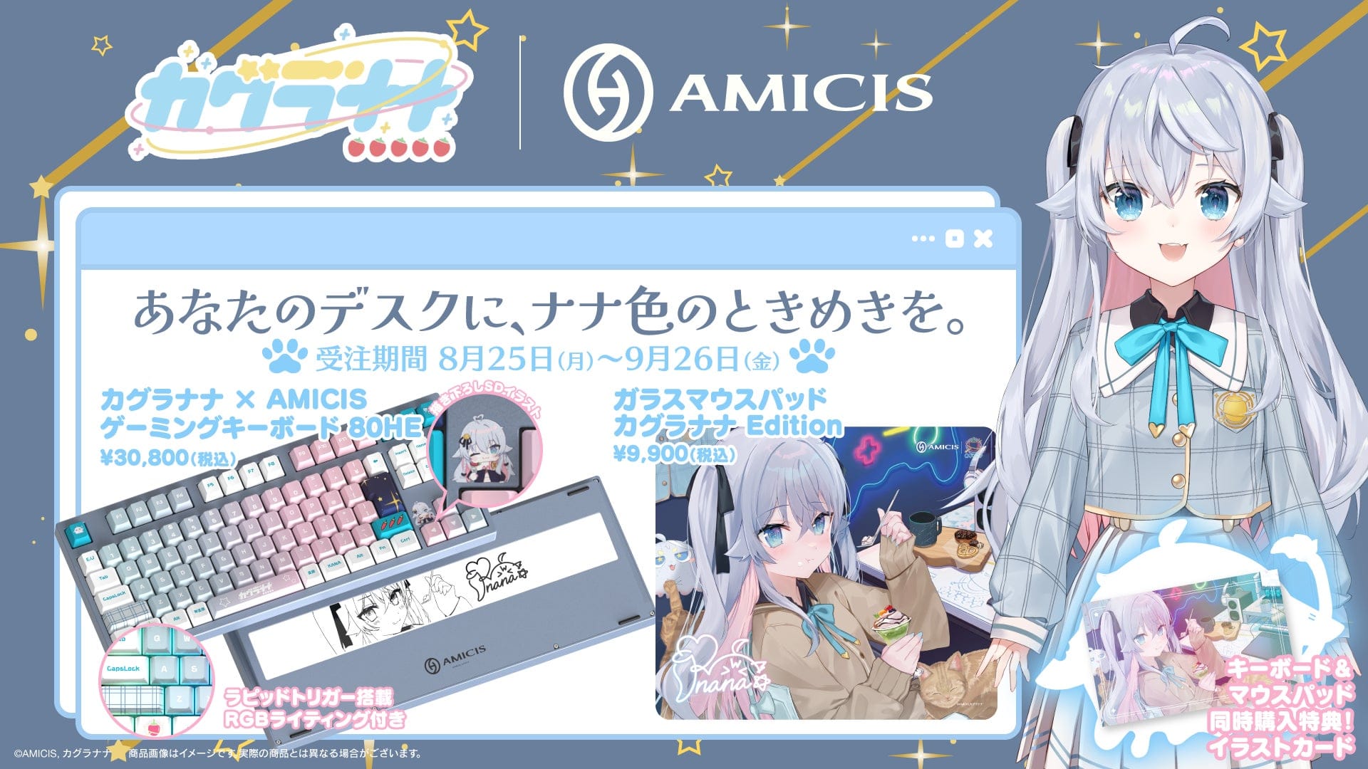 株式会社Game & Co.(Brave group完全子会社)が展開するブランド「AMICIS」は、バーチャルアーティスト・カグラナナとの限定コラボレーションデバイス「オリジナルゲーミングキーボード」と「ガラスマウスパッド」を、2025年8月25日(月)から9月26日(金)23:59まで期間限定で受注販売すると発表した。