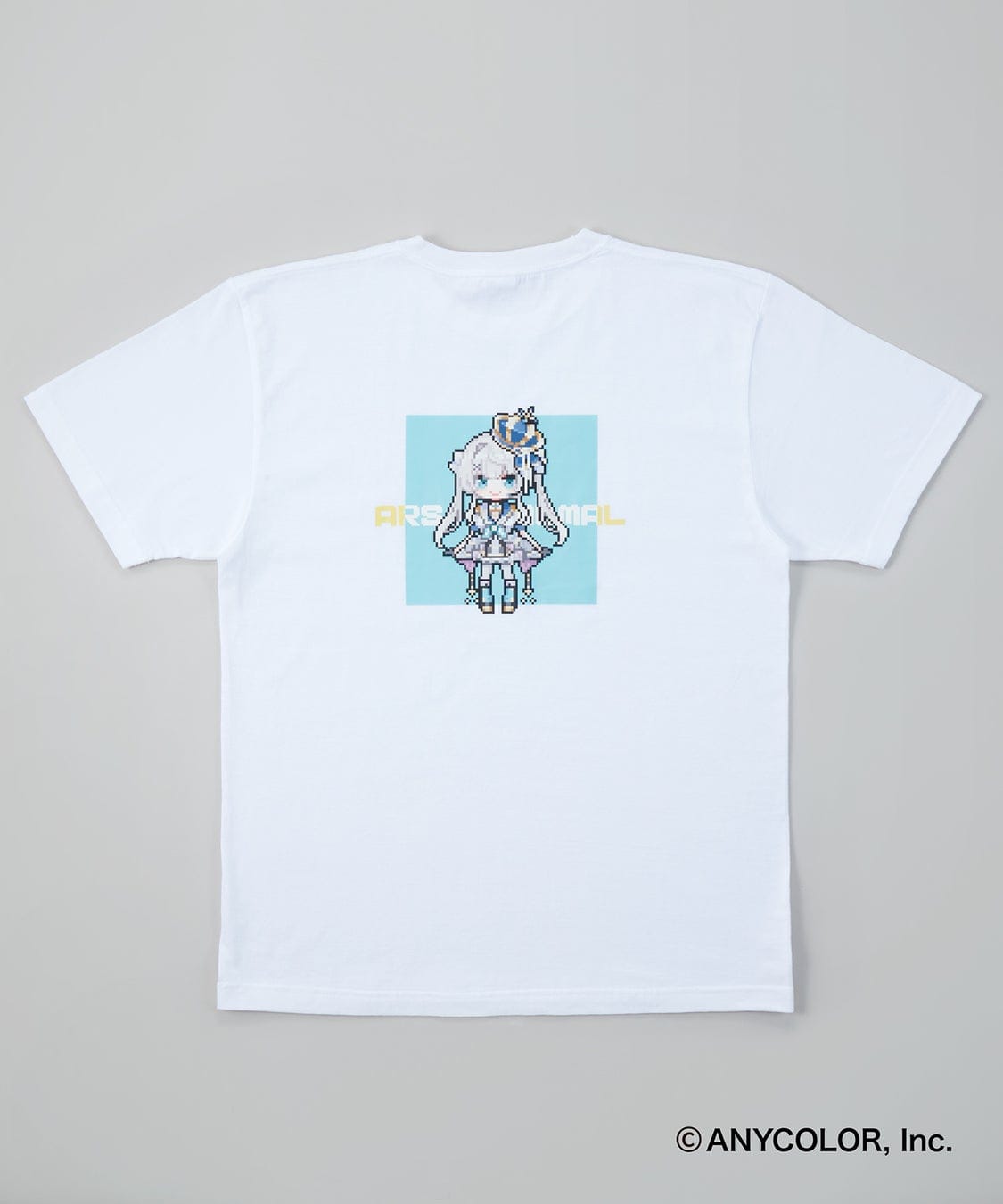 今回の商品は、8月25日に配信された「アルス・アルマル 新衣装3D お披露目配信」で公開された新衣装を基にしたデザインで、全7種類を展開。イラストレーター・ぶーた氏(@booota)による等身イラストと、キュアもと氏(@curemoto_dot)のドットイラストを使用したアパレルアイテムやグッズがラインナップされている。