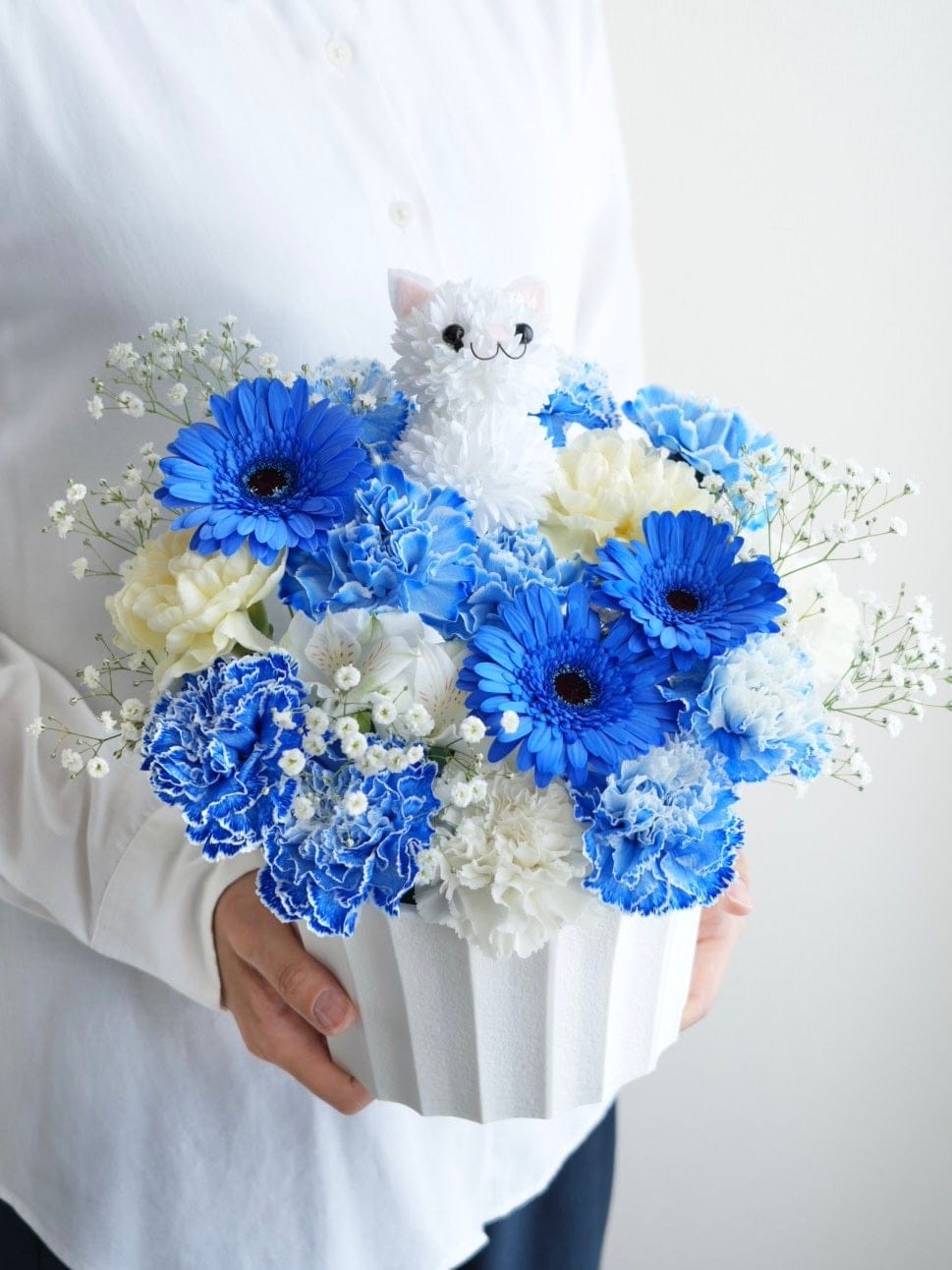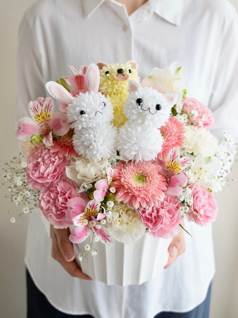 可愛らしいどうぶつをメインに、ふんわり可愛くまとめたアレンジ。お誕生日やお祝いはもちろん、推し活や公演花にもぴったり。可愛らしさと癒しをお届けする、特別なアレンジです。※どうぶつ部分のみ造花でお作りしております。