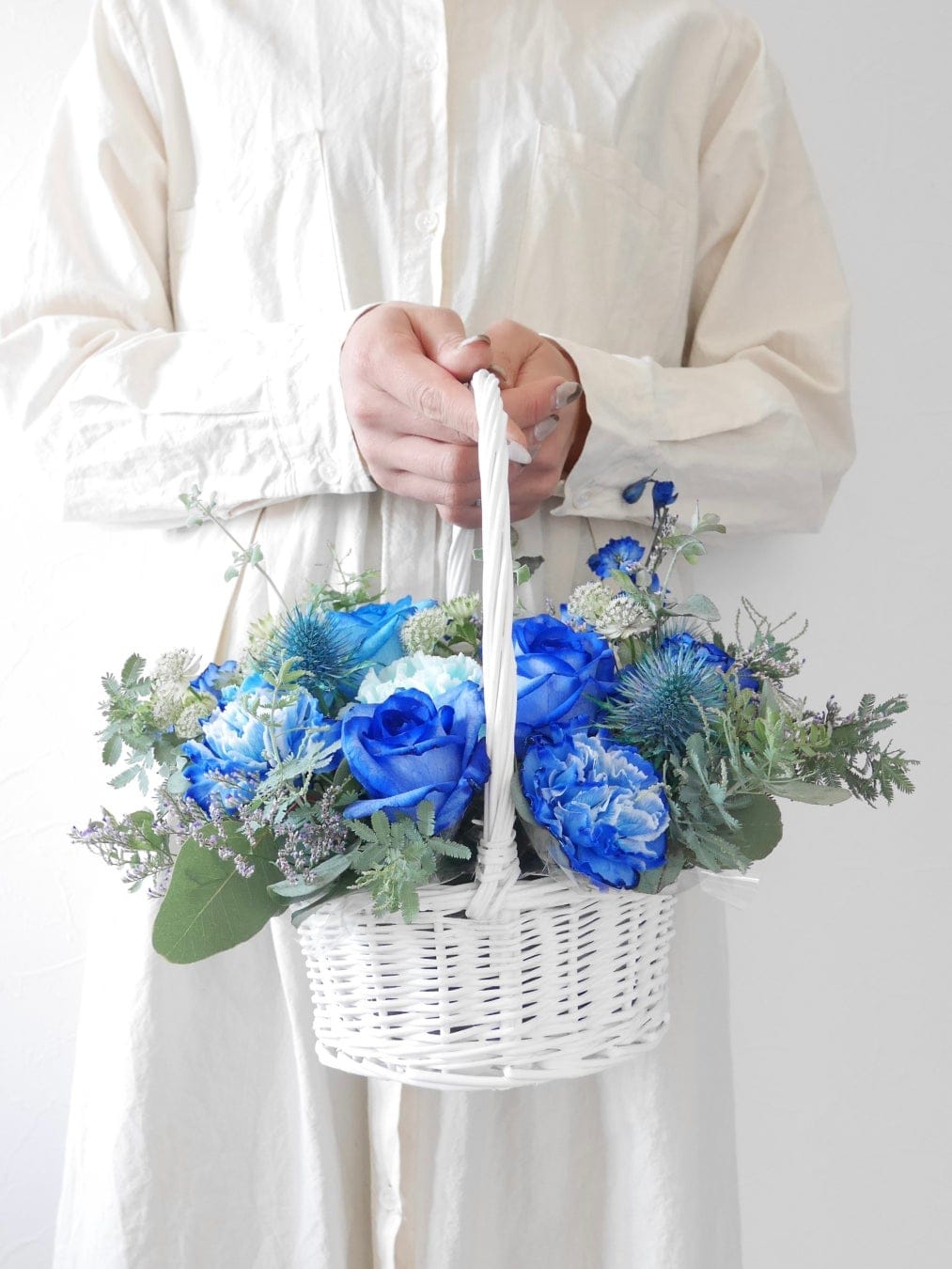 爽やかな白の取っ手付きのカゴにお花を敷き詰めたフラワーバスケットです。カゴいっぱいに摘んだお花入れたようなナチュラルなデザインに仕上げました。ライブや舞台公演の楽屋花としてもおすすめ。会場を明るく彩り、出演者の方への応援やお祝いの気持ちをやさしく届けてくれます。