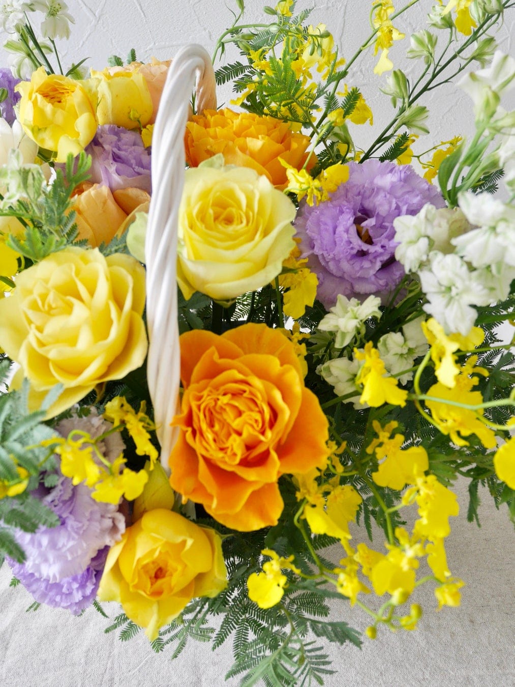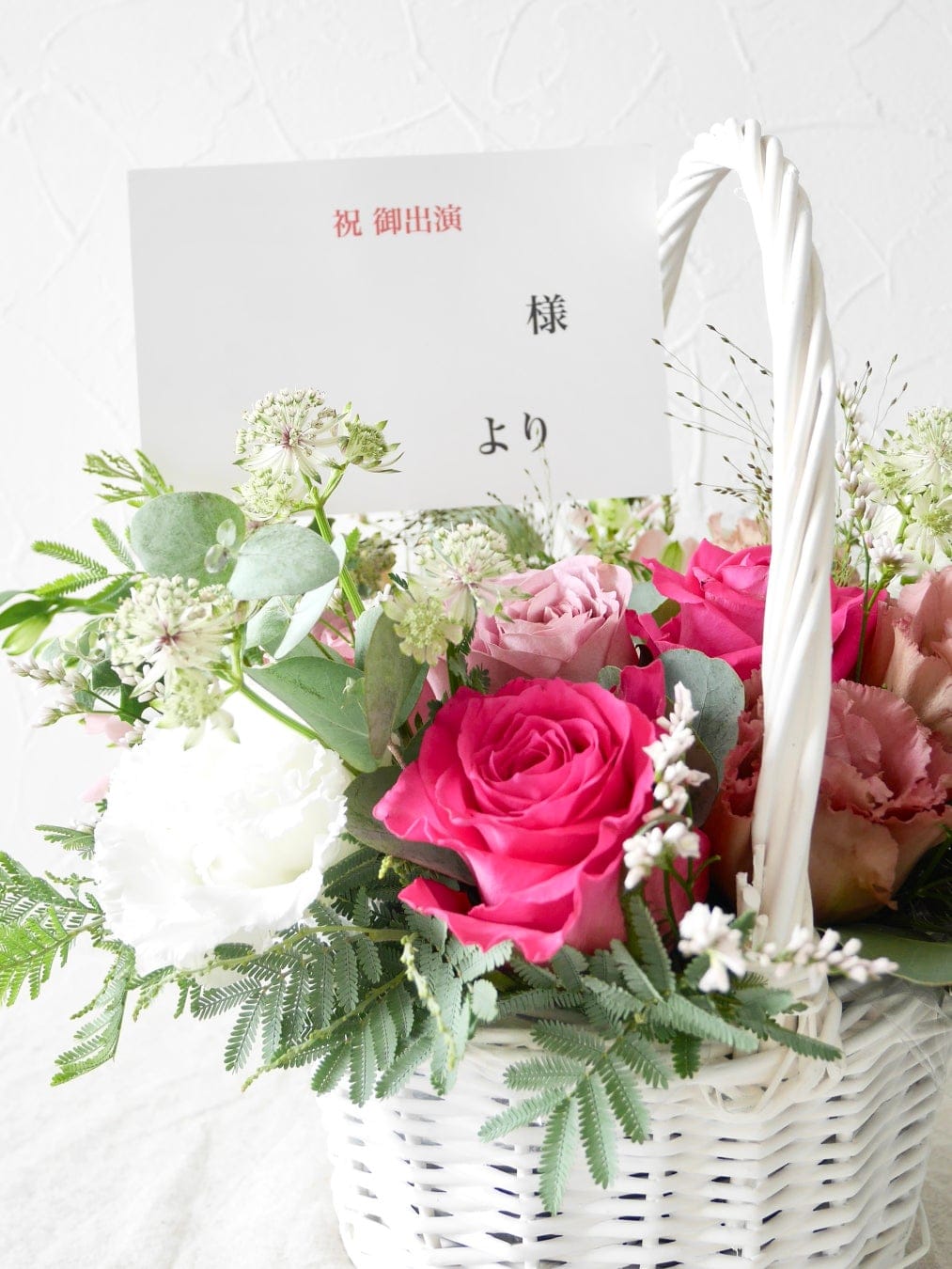 爽やかな白の取っ手付きのカゴにお花を敷き詰めたフラワーバスケットです。カゴいっぱいに摘んだお花入れたようなナチュラルなデザインに仕上げました。ライブや舞台公演の楽屋花としてもおすすめ。会場を明るく彩り、出演者の方への応援やお祝いの気持ちをやさしく届けてくれます。