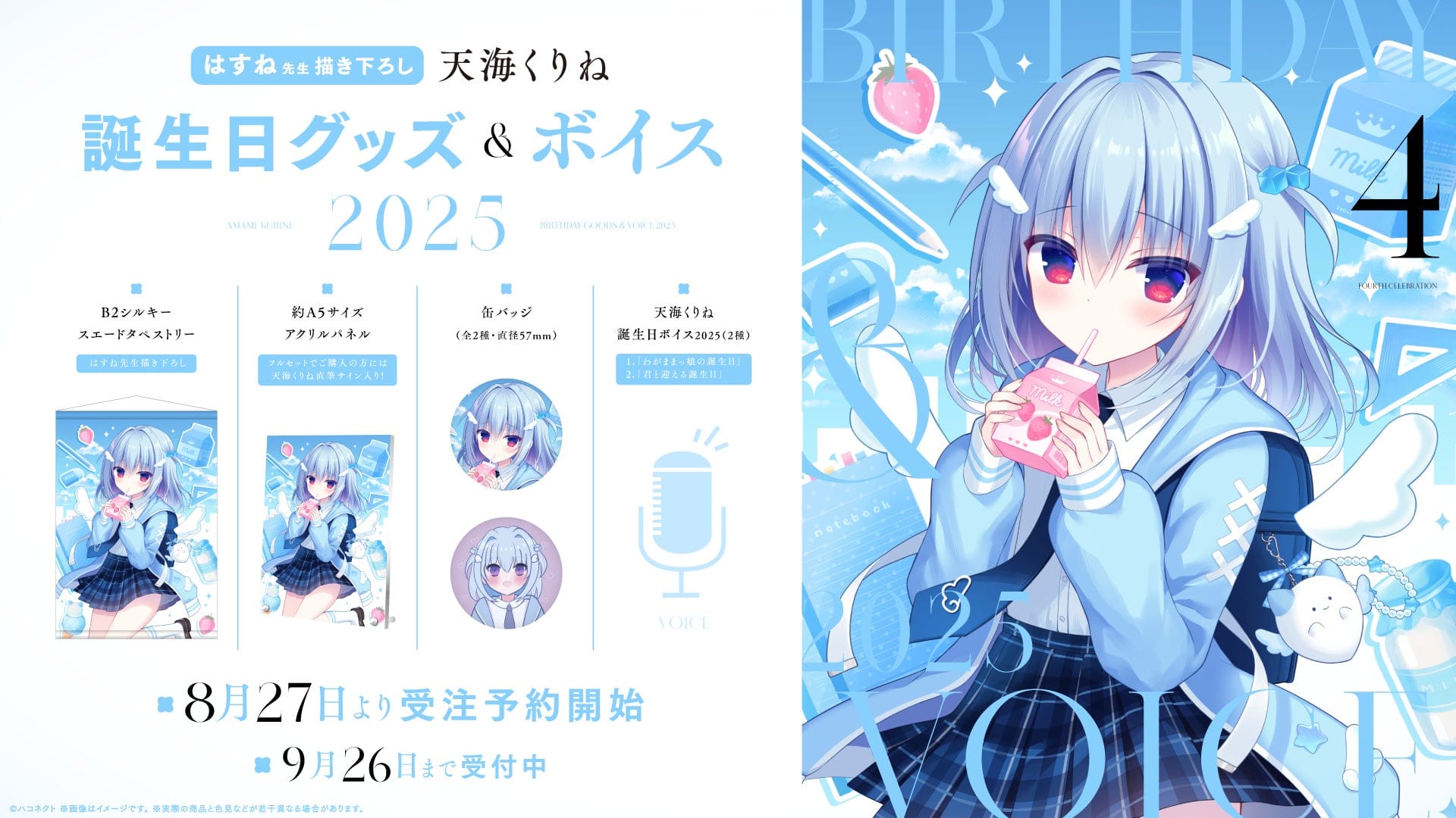 2025年8月27日(水)00時00分~2025年9月26日(金)23時59分までの期間、ハコネクト公式BOOTHにて『天海くりね誕生日グッズ&ボイス』を販売いたします。