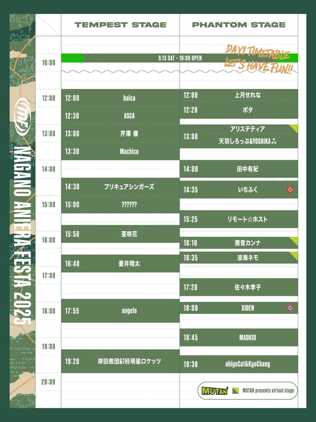2025年9月13日・14日に長野県佐久市の駒場公園で開催される「ナガノアニエラフェスタ2025」のタイムテーブルが公開された。MUTANが全面サポートする「Virtual Stage」には、同社プロデュースのVTuber「アリステティア」と新VTuber「熒(けい)」の出演が決定し、ラインナップが最終確定した。