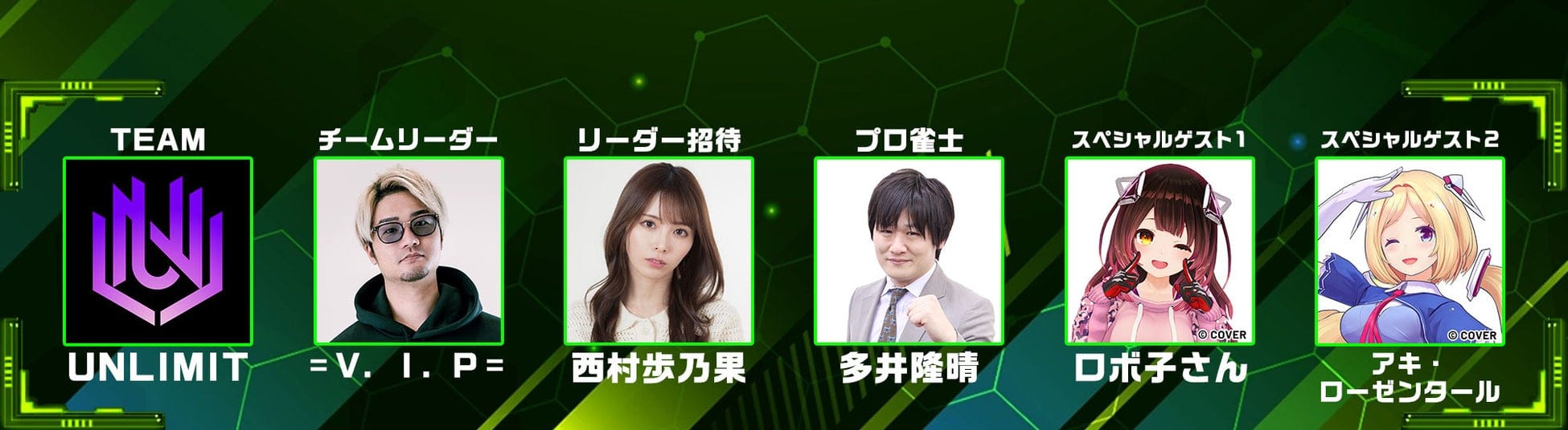 参加チームのUNLIMITには人気Vtuberのロボ子さんとアキ・ローゼンタールがスペシャルゲストとして登場。その他にもMリーグプロ雀士の多井隆晴、お笑い芸人の徳井健太ら豪華プレイヤー20名が参戦する。リーダーにはmittiiiやととみっくすら有名ストリーマーが就任予定だ。