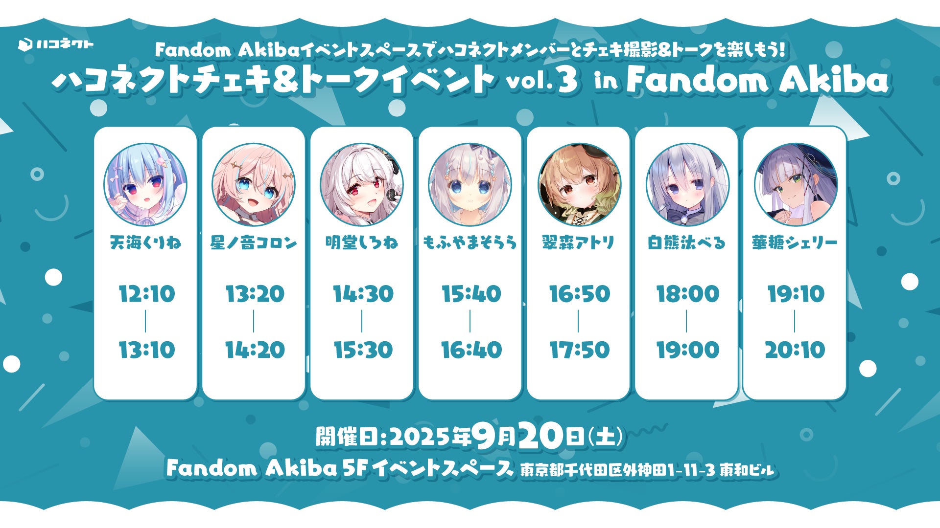 株式会社アナログ運営のVTuber事務所「ハコネクト」は2025年9月、専門店「Fandom Namba」(大阪)と「Fandom AKIBA」(東京・秋葉原)でミート&グリートおよびチェキ撮影イベントを開催すると発表した。
