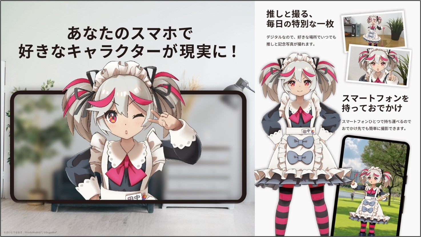 ホロモデルはスマートフォンやAR対応デバイスで楽しめる3Dデジタルフィギュアで、現実空間に等身大キャラクターを出現させたり自由なポージングで撮影できる。Meta Questなどのヘッドセットにも対応しており、次世代のキャラクターグッズとして注目されている。