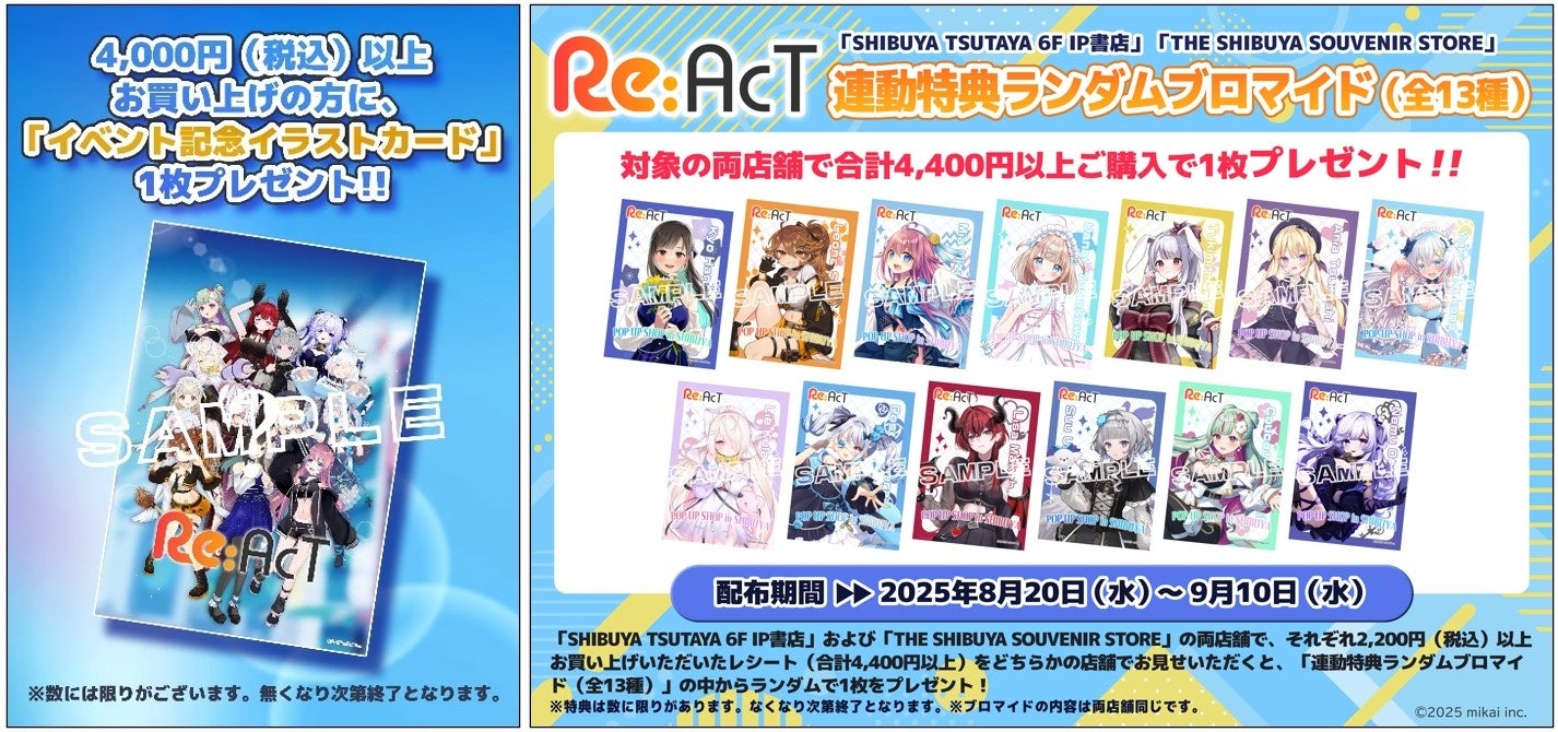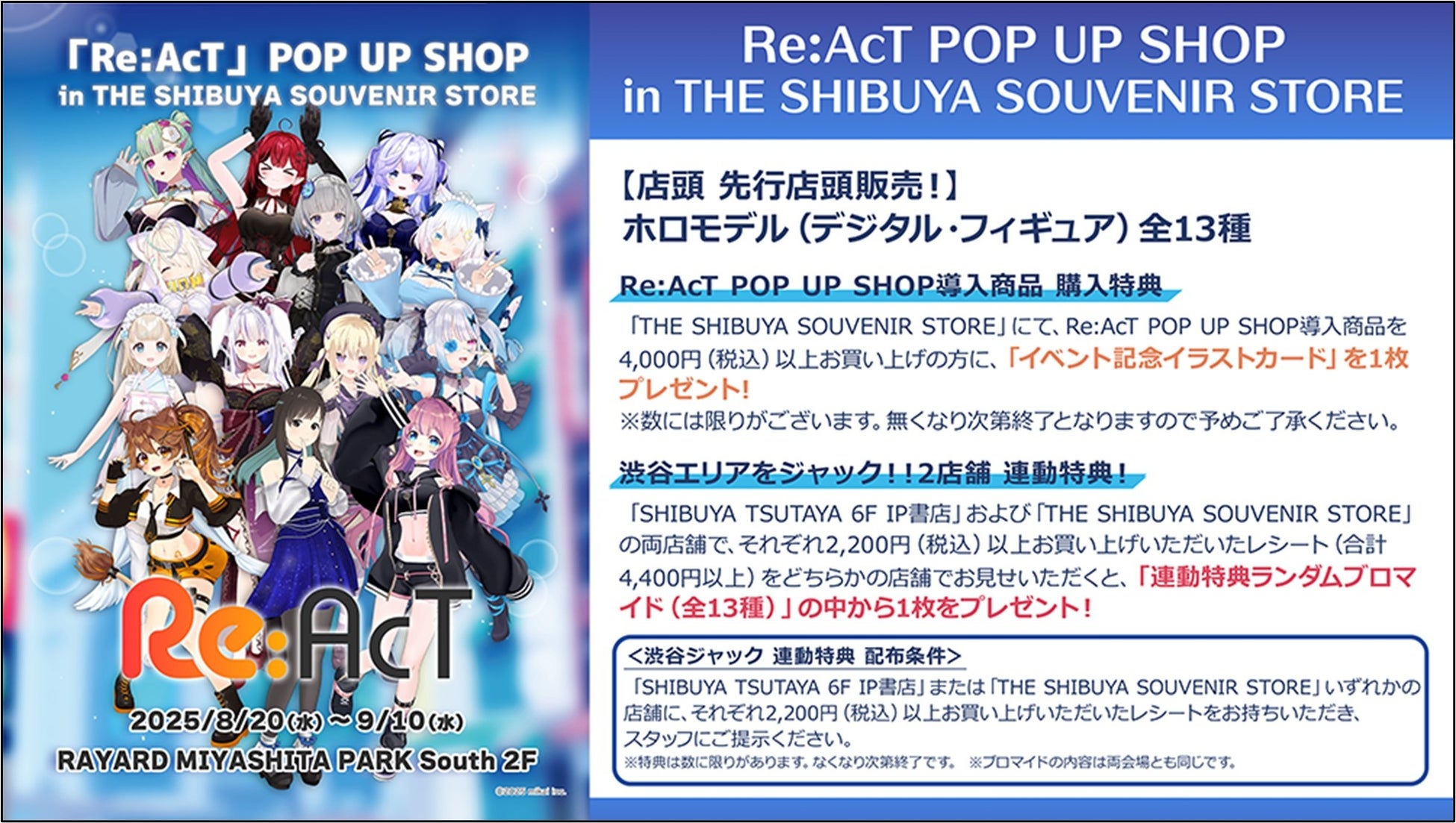 VTuber事務所『Re:AcT』の新作ホロモデル発売を記念し、期間限定のPOP UP SHOPをRAYARD MIYASHITA PARK South 2F「THE SHIBUYA SOUVENIR STORE」にて、2025年8月20日(水)からスタートし2025年9月10日(水)まで開催いたします。