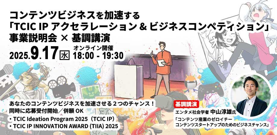 なお、9月17日(水)に本プログラムおよび「TCIC IP INNOVATION AWARD(IPを軸としたビジネスプランのコンペティション)」の説明会とエンタメ社会学者中山淳雄氏による基調講演も実施いたします。
