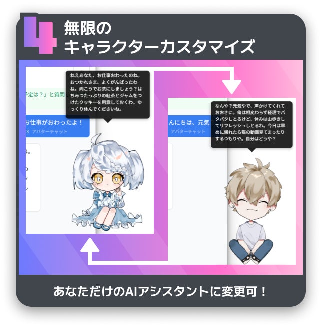 “キャラと過ごす”:png画像をアップロードするだけであなただけのアシスタントを作成可能。表情・ポーズの変化を楽しめます。