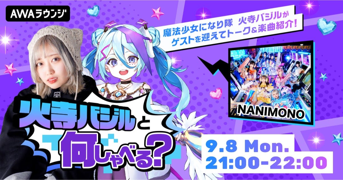 AWA株式会社(本社:東京都港区、代表取締役CEO:冨樫晃己)が運営する、サブスクリプション型(定額制)音楽ストリーミングサービス「AWA(アワ)」は、2025年9月8日21:00~22:00の1時間に渡り、無料で誰でも参加できるオンライン空間「AWAラウンジ」で、ロックバンド「魔法少女になり隊」のボーカルでアパレルブランドのプロデュースやVTuber配信などマルチに活動する火寺バジルがMCを務めるAWAラウンジ公式番組「火寺バジルと何しゃべる?」の第3回を開催いたします。