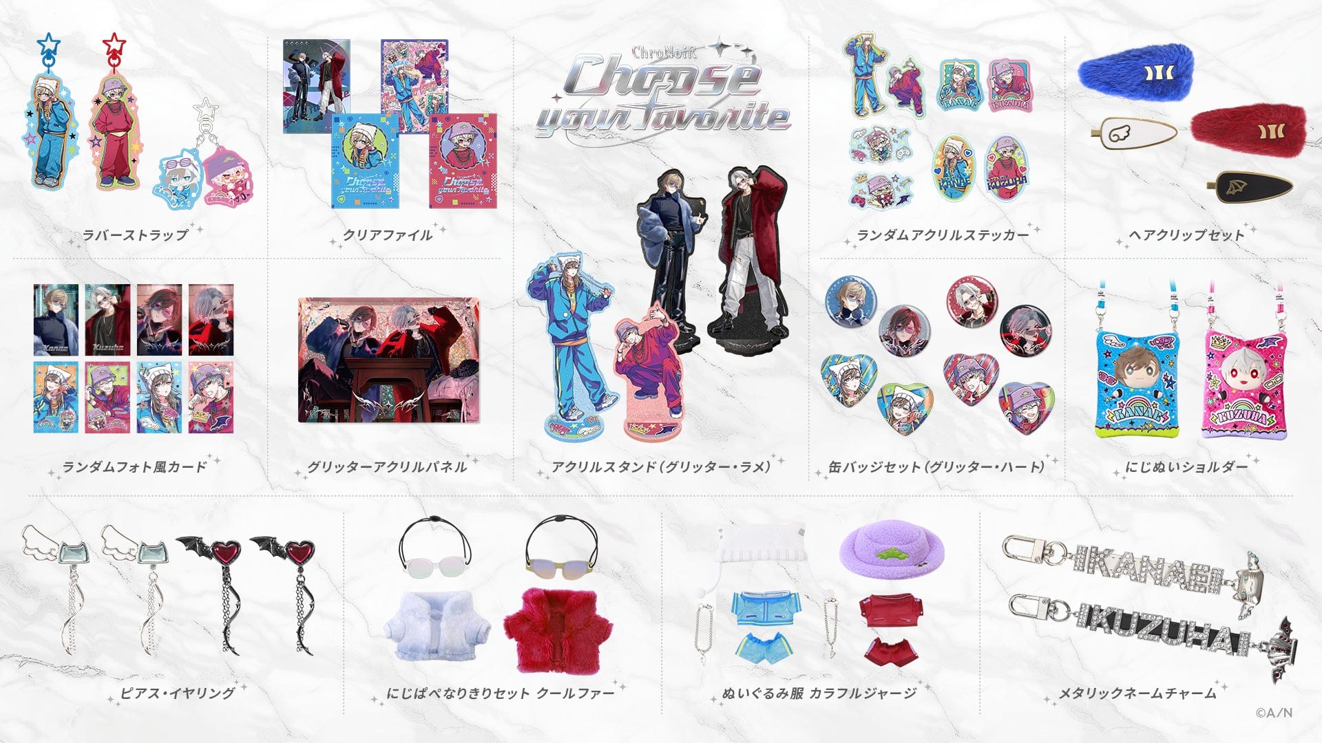 グッズラインナップは、グリッターやラメが輝くそれぞれの撮りおろしビジュアルを使用したアクリルスタンドや『【ChroNoiR 7th ANNIVERSARY】ポージングぬいぐるみ』に着せることが出来る衣装のほか、ChroNoiRのモチーフをちりばめたヘアクリップやイヤリング、ピアスなど、全13種類が登場!