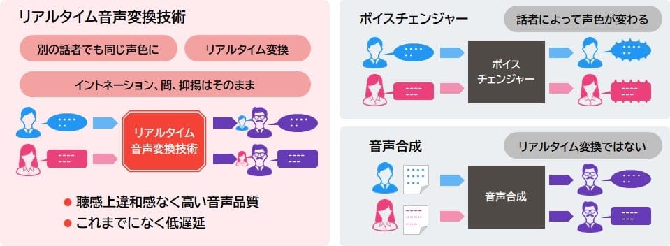 近年、AI技術の進展により、音声の認識やテキストから音声を合成する音声合成の精度が向上し、音声をベースとしたサービスがさまざまな分野に広がっています。その一方で、話者の声を別の声に変える「音声変換」は処理の複雑さから変換に時間がかかり、遅延によって会話の流れを妨げてしまう課題がありました。また、従来の「ボイスチェンジャー」では機械的な音声となるため、声の秘匿や娯楽用途には利用されるものの、自然な会話が求められる場面には不向きでした。