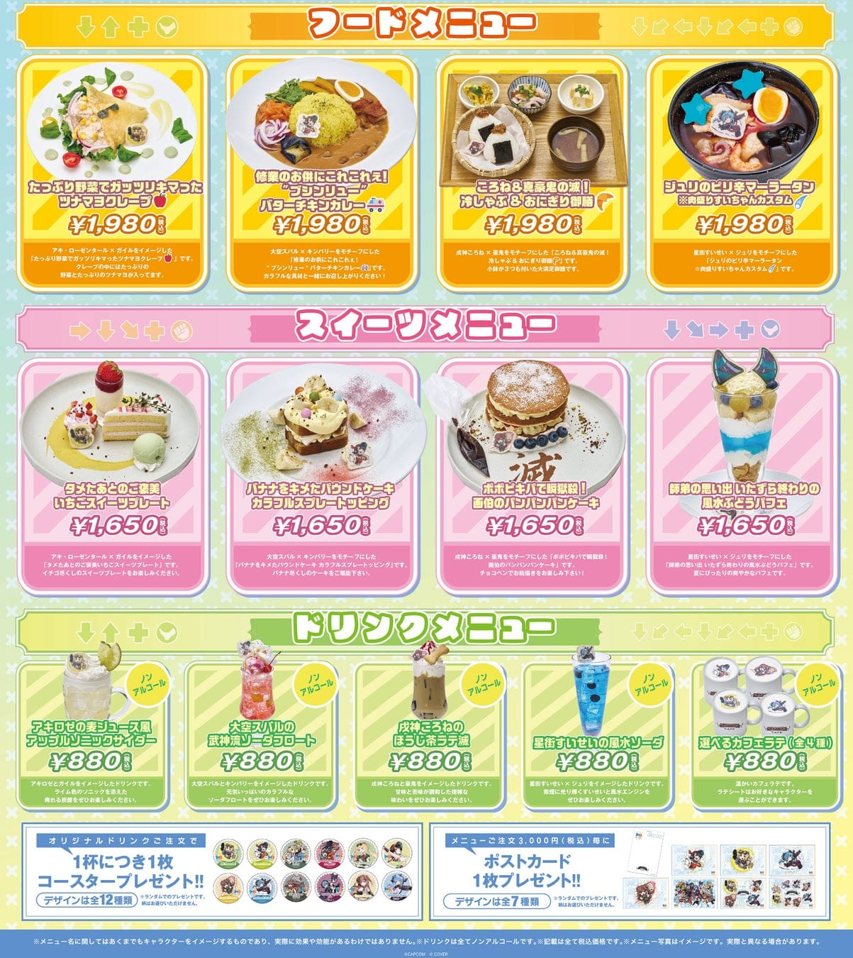 カプコンカフェにてオリジナルドリンクをご注文いただいた方にはコースター(全12種の中から1枚をランダム)をプレゼントします。さらにカフェメニューのご利用3,000円(税込)毎にポストカード(全6種の中から1枚をランダム)を1枚プレゼントいたします。