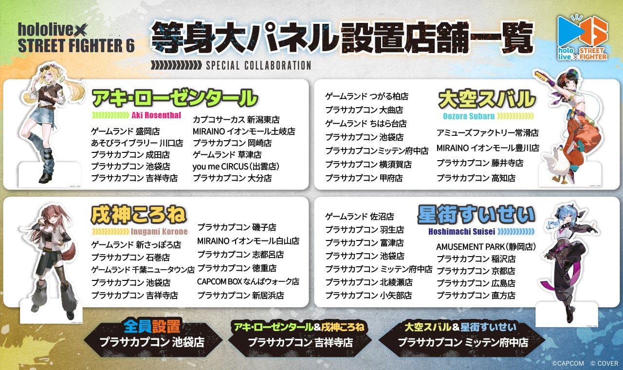 コラボ開始に合わせて、各店舗にて「ストリートファイター6×ホロライブ」のクレーンゲームが登場! さらに「プラサカプコン 池袋店」ではスペシャルコラボ店舗として特別装飾も展開。さらに等身大パネルも設置いたします。