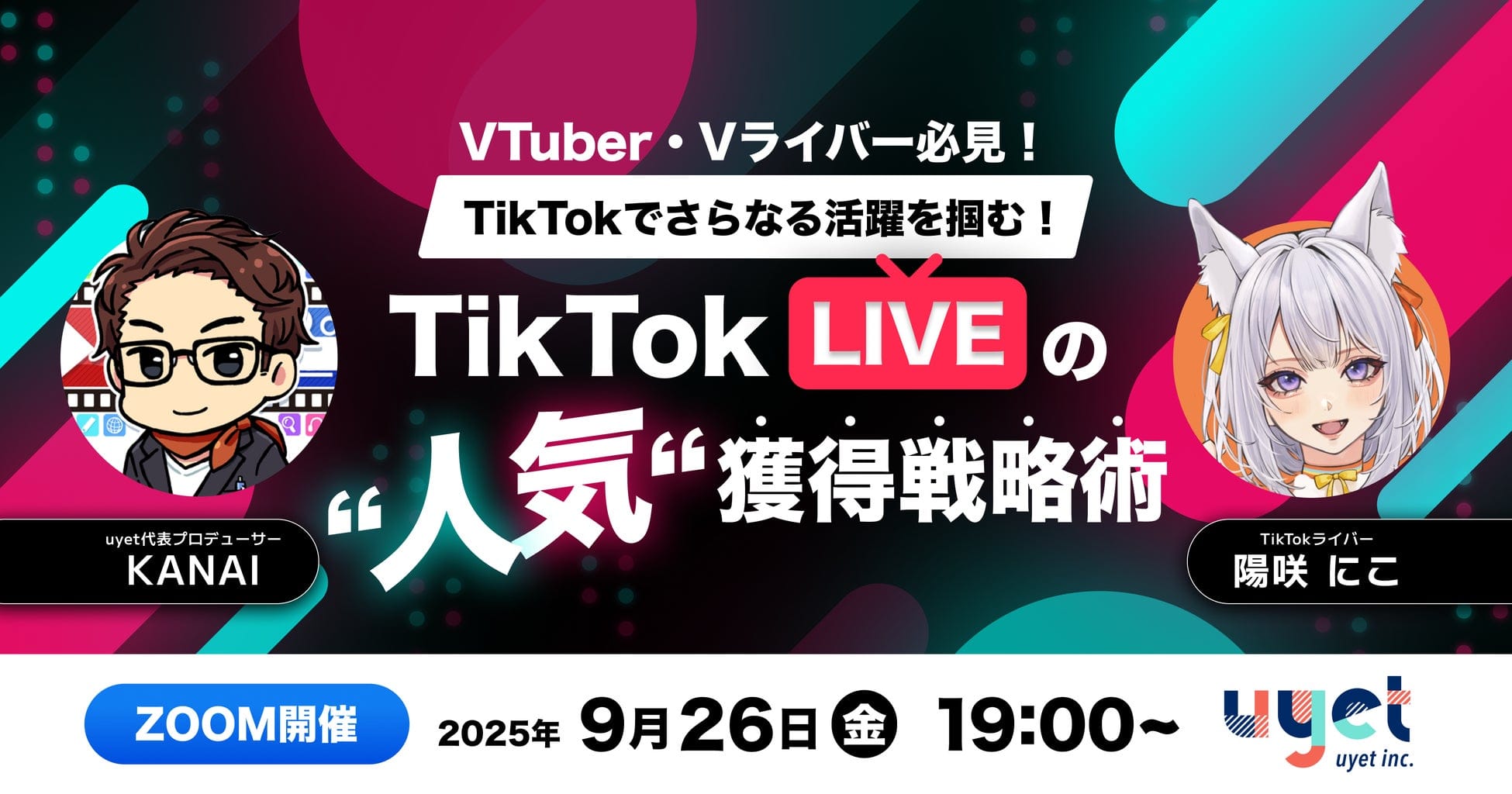 株式会社uyetは、VTuberやVライバー向けのウェビナー「TikTokで更なる活躍を掴む!TikTok LIVEの人気獲得戦略術」を2025年9月26日(金)19:00からオンラインで開催すると発表しました。