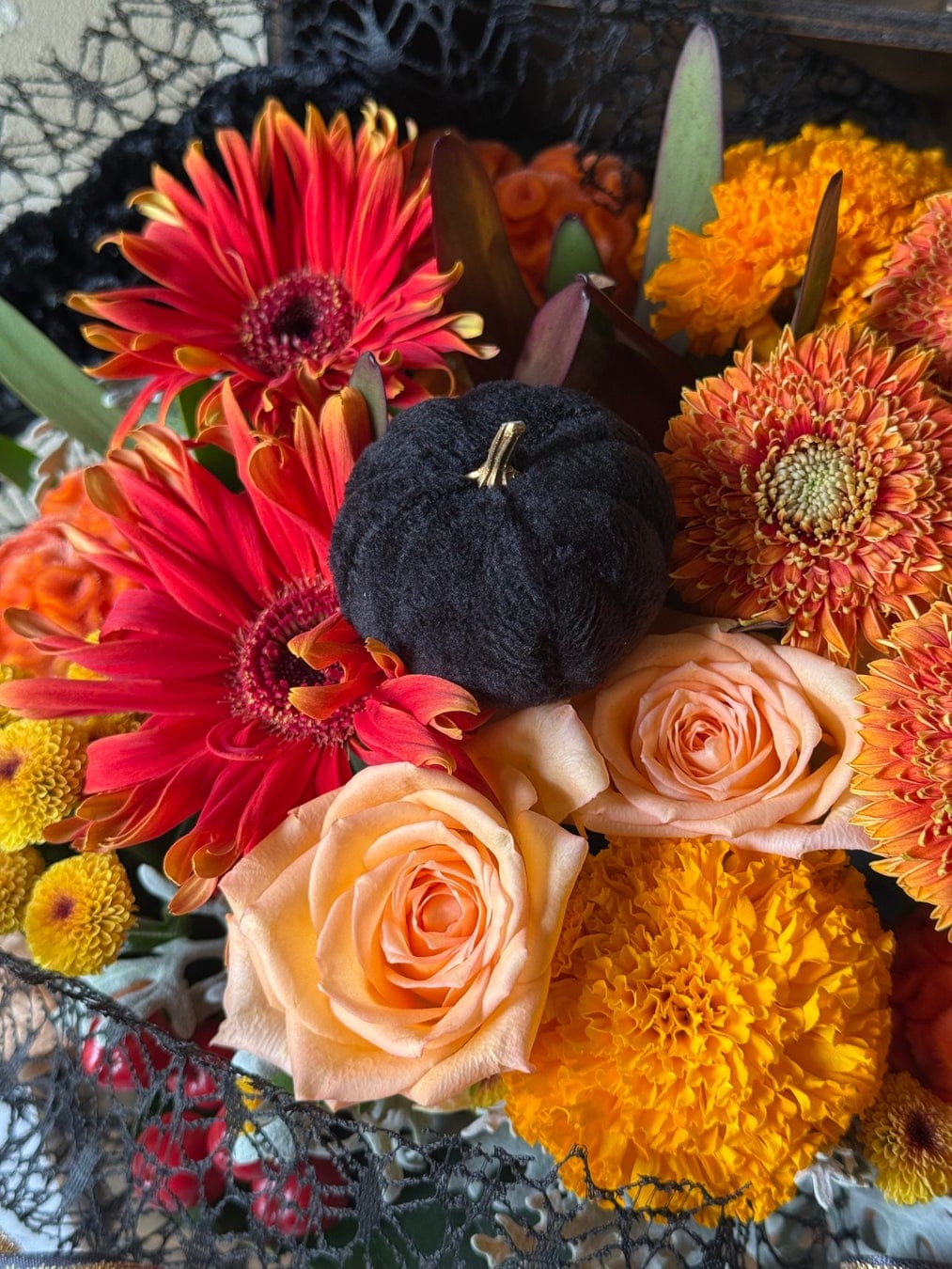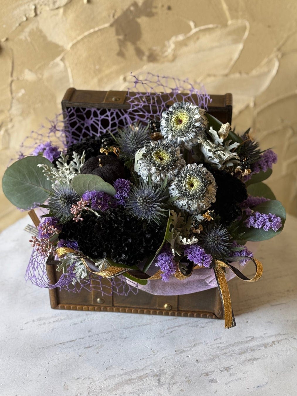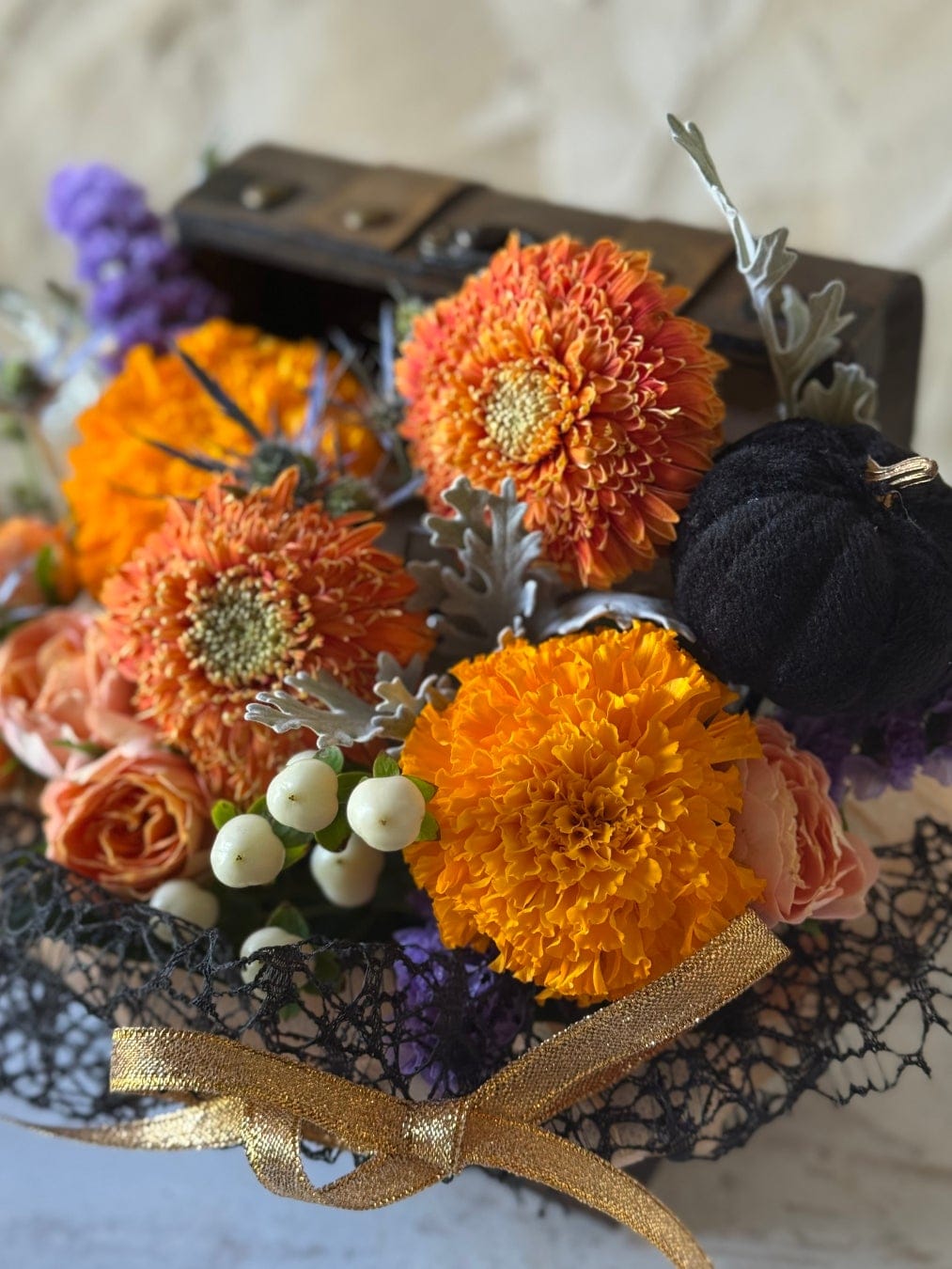 かぼちゃ、リボンをアクセントにした、ハロウィンムードたっぷりのアレンジメント。 アンティーク調のトレジャーボックスに花々を詰め込み、華やかで遊び心あふれるデザインに仕上げました。