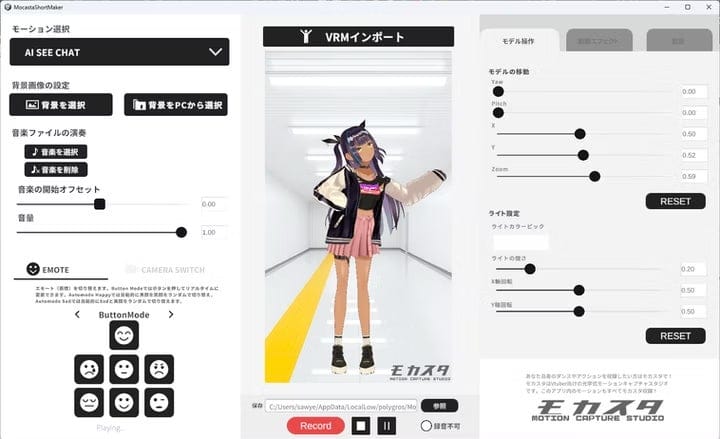 「モカスタアプリ」では、専門知識がなくてもVRMをインポートし、自社の光学式モーションキャプチャスタジオで収録された、高品質のモーションデータを無料で自由に使って、ダンスショーと動画などを作成することができます。「モカスタアプリ」で作成した動画は、企業・個人問わず商用利用が可能です。