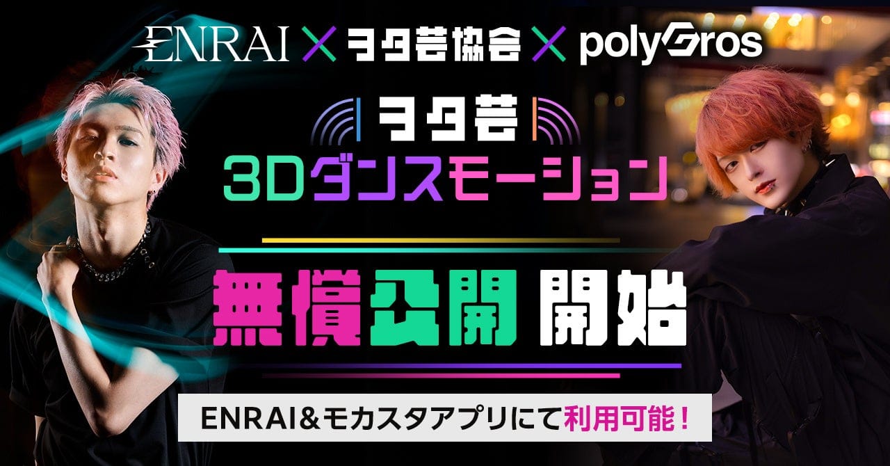 公開された3Dデータは、実際のパフォーマーによるヲタ芸をモーションキャプチャで再現したもので、「ロマンス」「サンダースネイク」といった定番の動きから「ナルメア」などの高度な技まで網羅されています。モーションデータは「ENRAI特設ページ」および「モカスタアプリ」から利用可能です。
