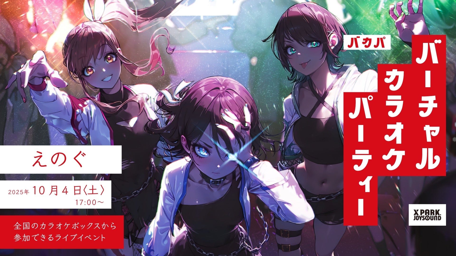 株式会社エクシングと株式会社パノラプロは、JOYSOUNDのエンターテインメント・プラットフォーム「X PARK」を活用した新感覚のライブイベント「バーチャルカラオケパーティー」を開催するとのことです。その第一弾として、2025年10月4日(土)にバーチャルアイドル「えのぐ」のライブを実施することが決定しました。