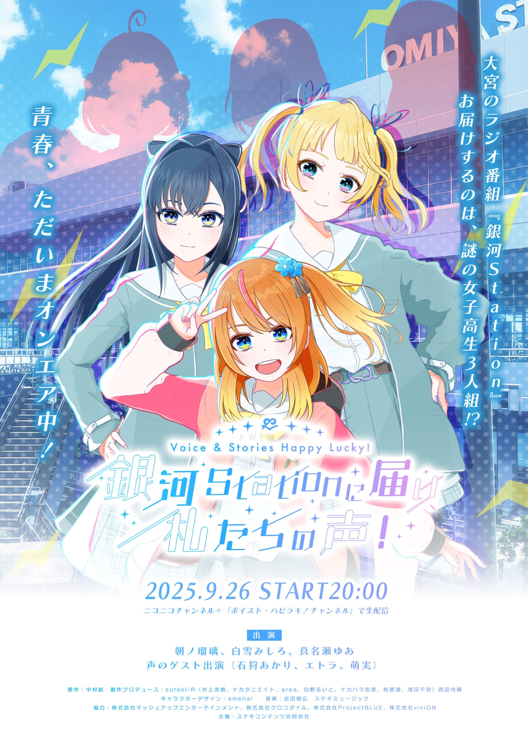 ステキコンテンツ合同会社(本社:東京都中央区 代表:中村 航)は、新感覚メディアミックスプロジェクト「Voice & Stories Happy Lucky! ボイスト・ハピラキ!」の新キャラクターについて、VTuberグループ「あおぎり高校」より、石狩あかり、エトラ、萌実をキャストとして起用することを決定しました。新キャラクターは2025年9月26日の配信公演「Voice & Stories Happy Lucky!『銀河Stationに届け、私たちの声!』」にゲスト出演(声のみ)します。