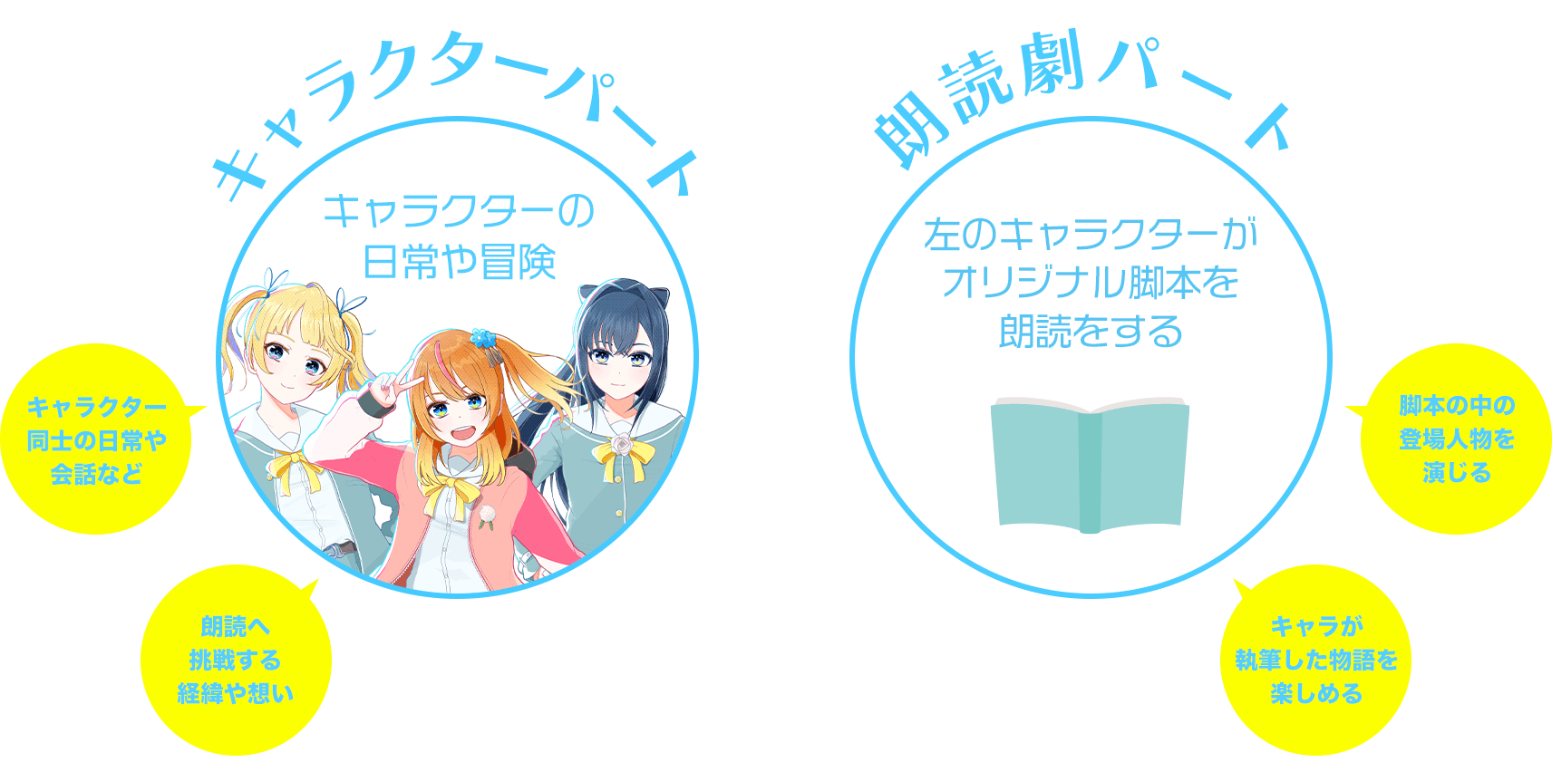 ボイストの公演は、キャラクターの日常と冒険が楽しめるキャラクターパートと、そのキャラクターがオリジナル脚本を朗読する朗読劇パートに分かれます。