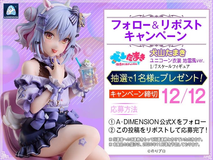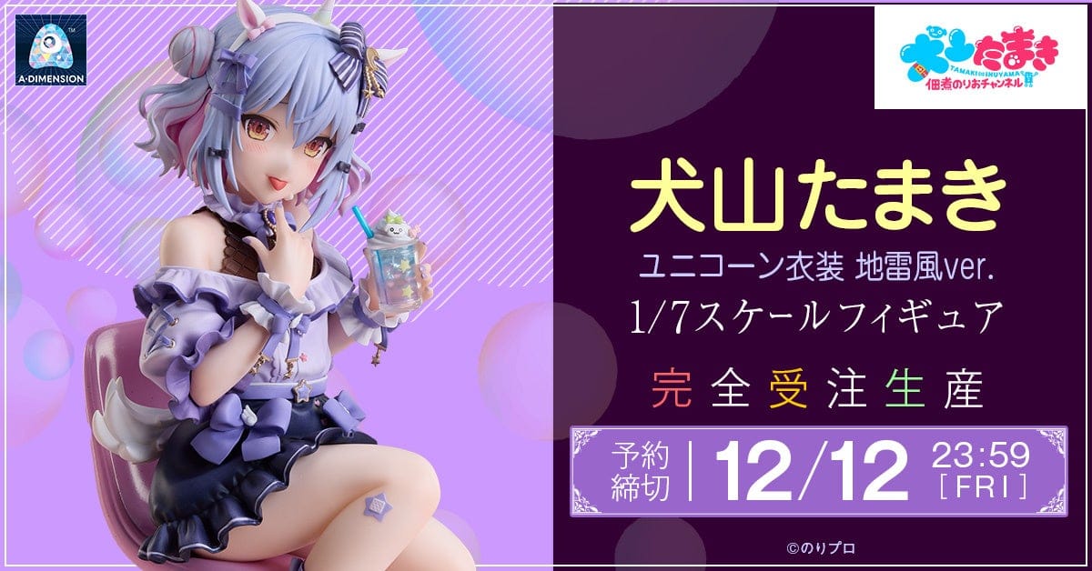 株式会社A・DIMENSION(Aディメンション)(本社:東京都台東区、代表取締役社長:上村篤)は、「のりプロ」の大人気“男の娘VTuber” 犬山たまきさんが、2024年の「犬山たまき生誕祭」で披露した「ユニコーン衣装 地雷風」を1/7スケールフィギュア化した『のりプロ 犬山たまき ユニコーン衣装 地雷風ver. 1/7スケールフィギュア』の発売を決定し、予約受付を2025年9月22日(月)10:00より開始いたします。